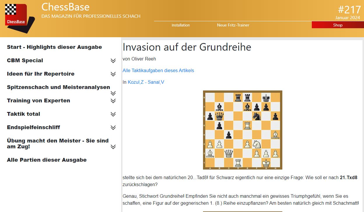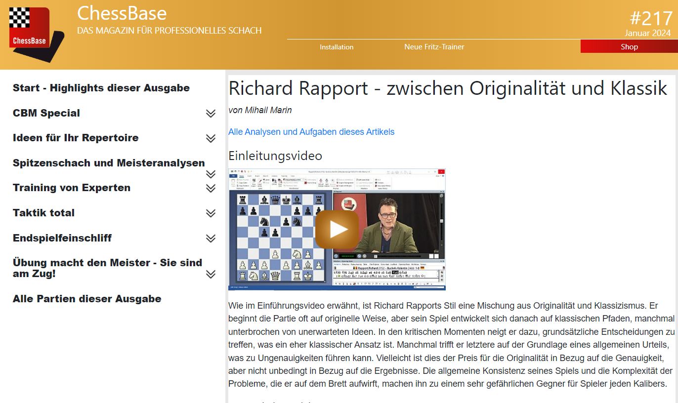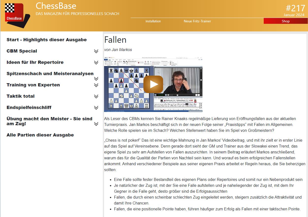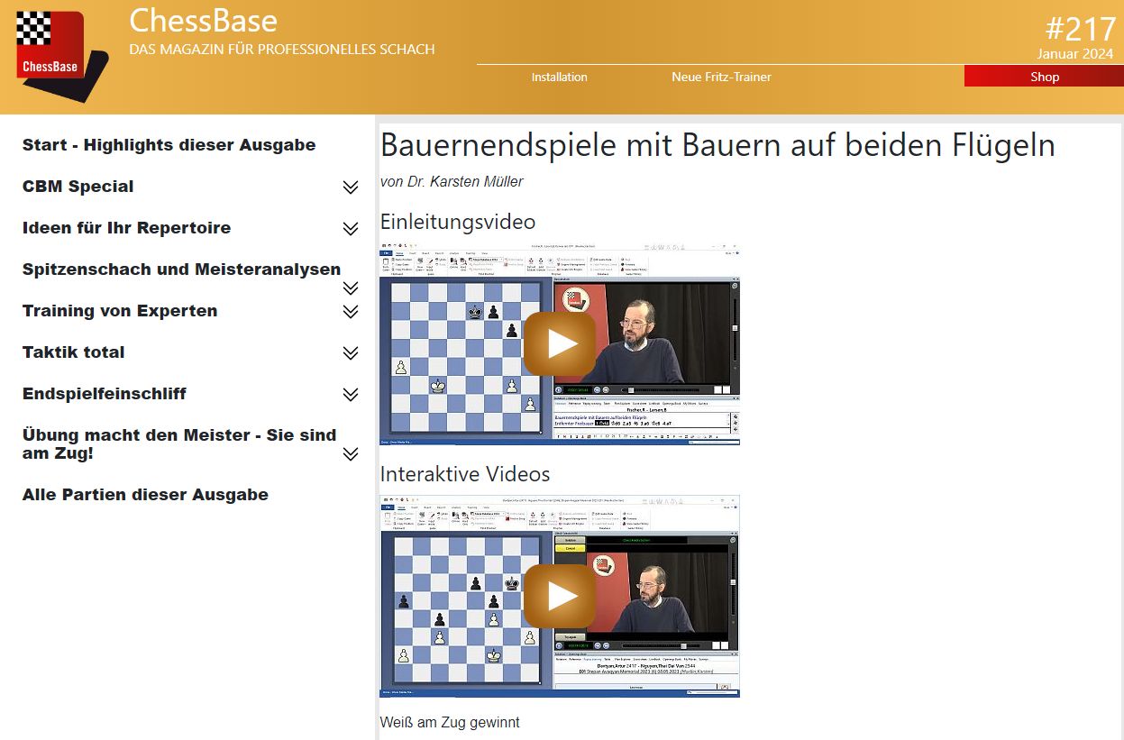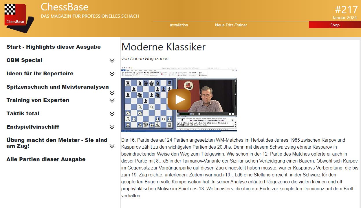 Das ChessBase Magazin bietet erstklassiges Trainingsmaterial für Vereinsspieler und Profis! Weltklassespieler analysieren ihre Glanzpartien und erklären Ihnen die Ideen hinter den Zügen. Eröffnungsspezialisten präsentieren die neuesten Trends in der Eröffnungstheorie und spannende Ideen für Ihr Repertoire. Meistertrainer in Sachen Taktik, Strategie und Endspiel zeigen Ihnen genau die Tricks und Techniken, die man als erfolgreicher Turnierspieler braucht! Lieferbar als Download (inkl. Heft als pdf-Datei) oder auf DVD mit Begleitheft per Post.