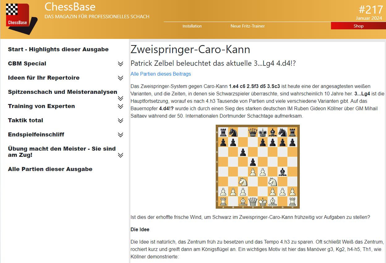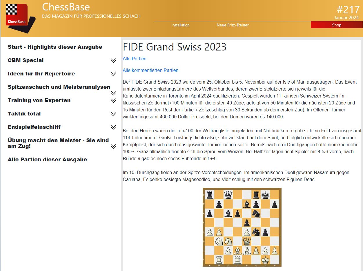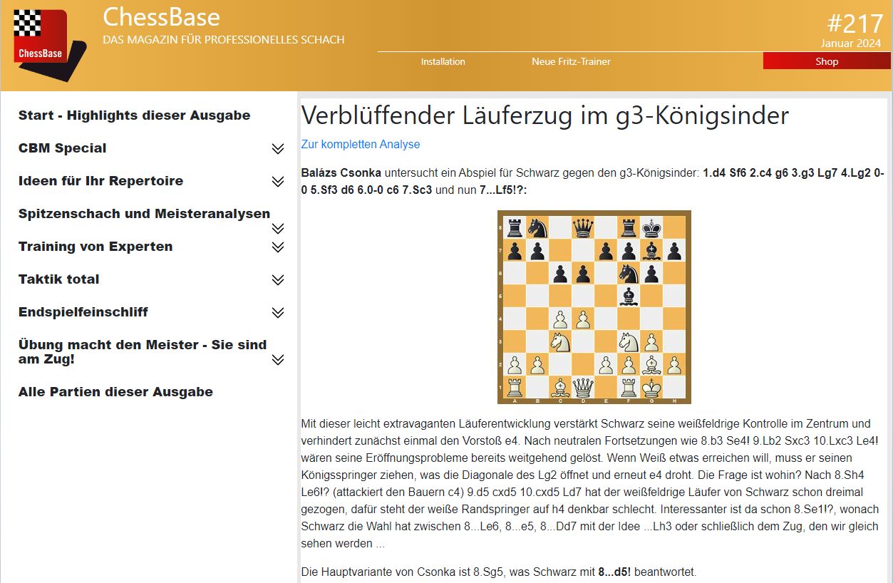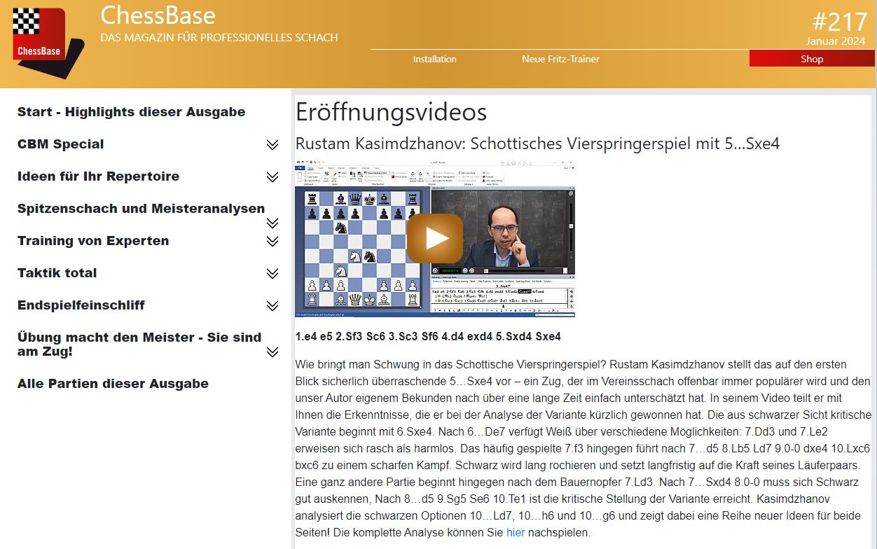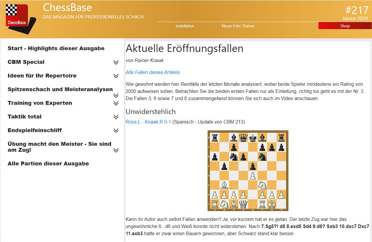 Das ChessBase Magazin bietet erstklassiges Trainingsmaterial für Vereinsspieler und Profis! Weltklassespieler analysieren ihre Glanzpartien und erklären Ihnen die Ideen hinter den Zügen. Eröffnungsspezialisten präsentieren die neuesten Trends in der Eröffnungstheorie und spannende Ideen für Ihr Repertoire. Meistertrainer in Sachen Taktik, Strategie und Endspiel zeigen Ihnen genau die Tricks und Techniken, die man als erfolgreicher Turnierspieler braucht! Lieferbar als Download (inkl. Heft als pdf-Datei) oder auf DVD mit Begleitheft per Post.