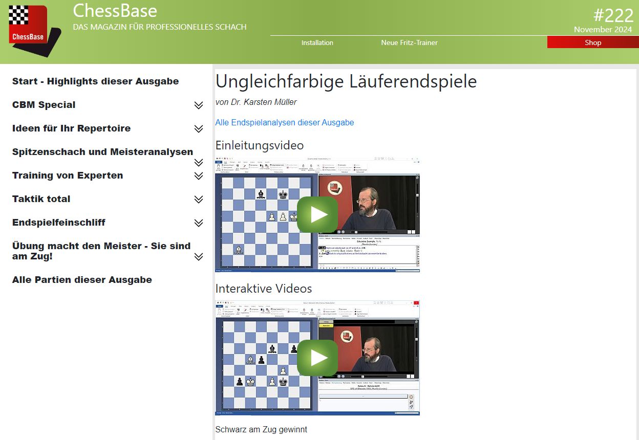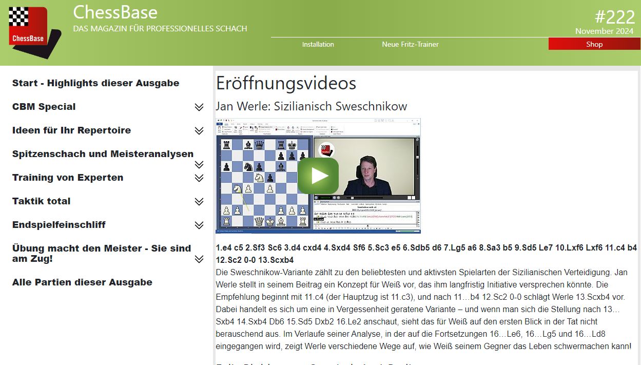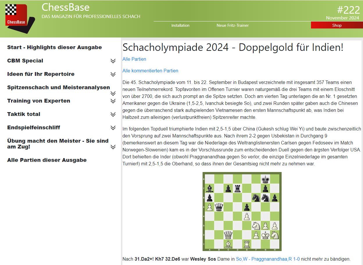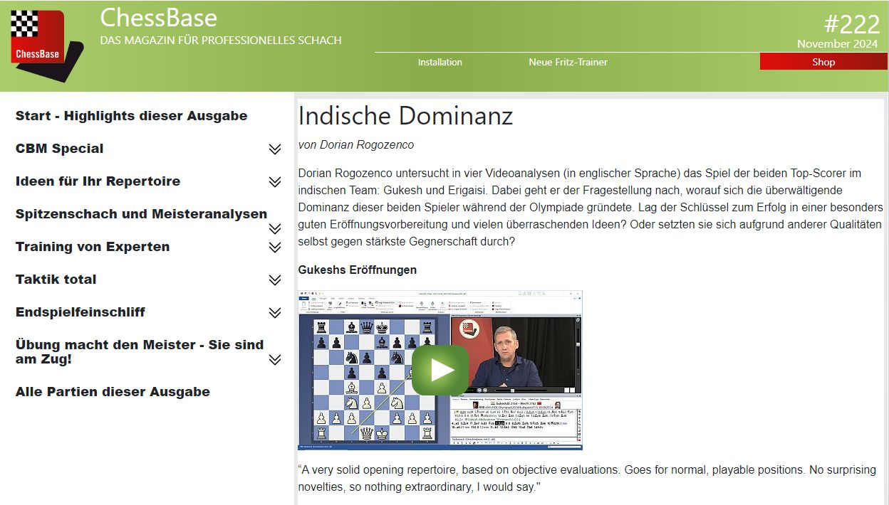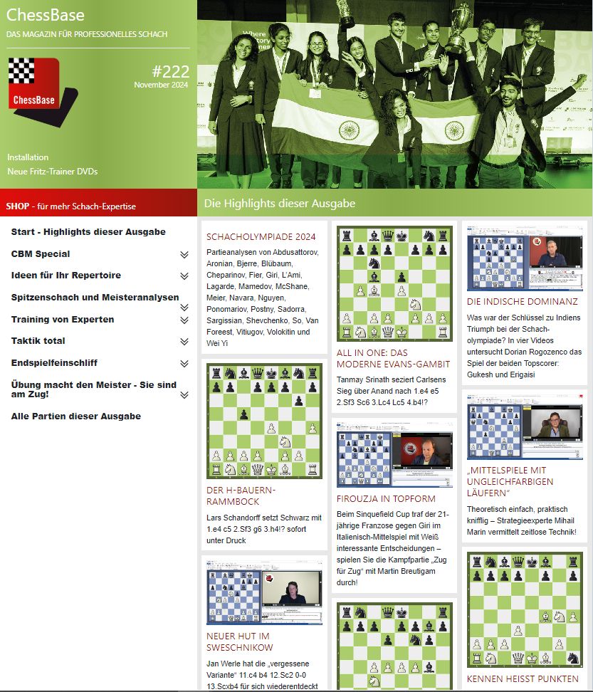 Über 6 Stunden Videospielzeit mit Felix Blohberger, Martin Breutigam, Jan Markos, Mihail Marin, Karsten Müller, Oliver Reeh, Robert Ris, Dorian Rogozenco, Jan Werle und Nico Zwirs – Schacholympiade 2024: Doppelsieg für Indien! Analysen von Abdusattorov, Aronian, Giri, So u.v.a. – „Special“: Dorian Rogozenco geht dem Geheimnis der indischen Dominanz in vier Videoanalysen auf den Grund – „All in One“ zum modernen Evans-Gambit: Tanmay Srinath seziert Carlsens Sieg über Anand nach 1.e4 e5 2.Sf3 Sc6 3.Lc4 Lc5 4.b4!? – Firouzja in Topform: Martin Breutigam spielt die Kampfparte Firouzja-Giri „Zug für Zug“ mit Ihnen durch! – „Ins Eröffnungsgras gebissen“: In Oliver Reehs Taktikkolumne mit 39 Partien und vier interaktive Videos geht es um frühe Fiaskos! – „Action in der Spanisch-Abtauschvariante“: Evgeny Postny beleuchtet 5.0–0 Lg4 6.h3 h5 7.d3 Df6 8.Sbd2 g5!? u.v.m.
