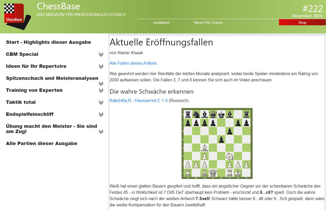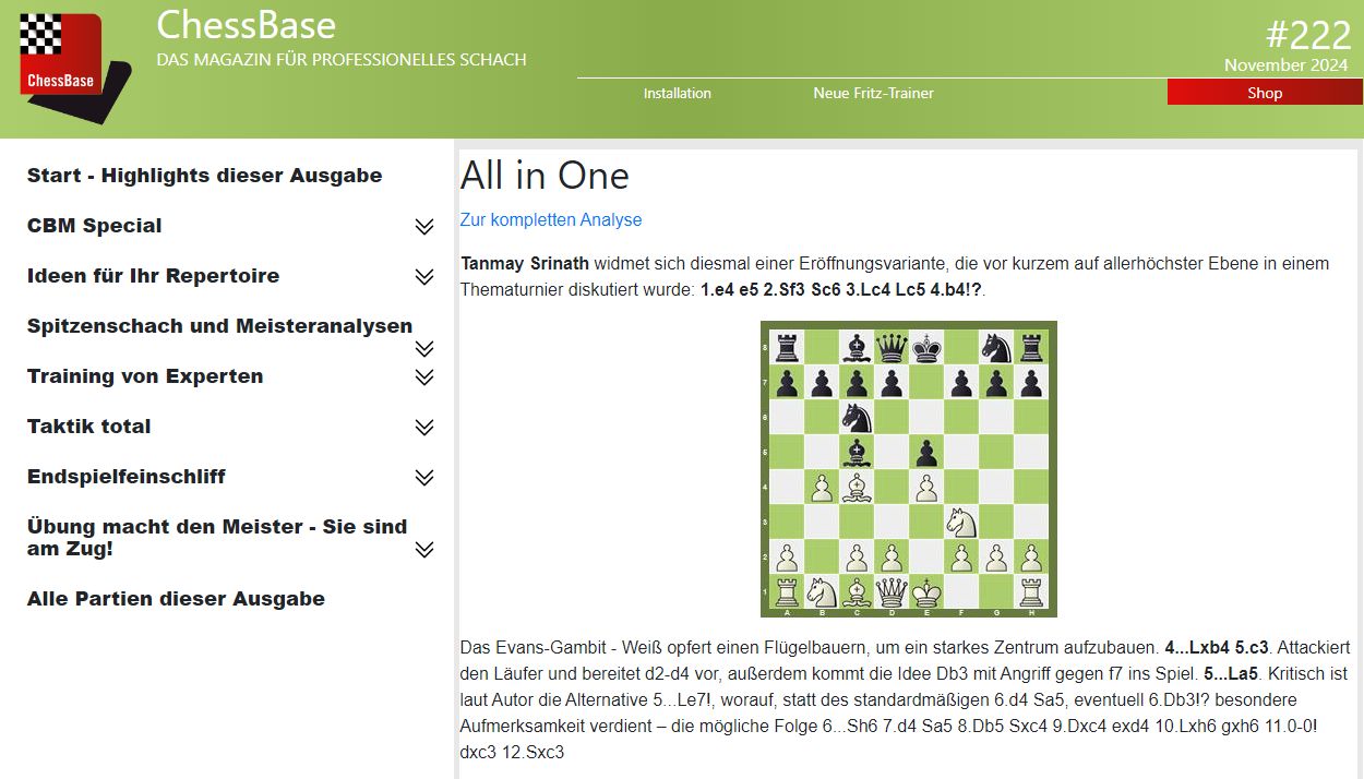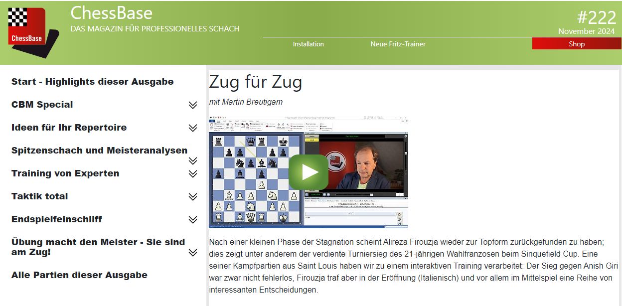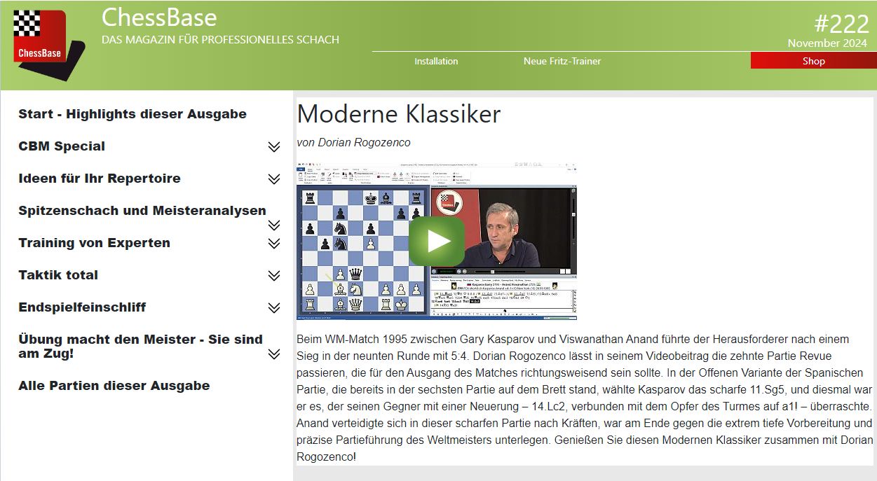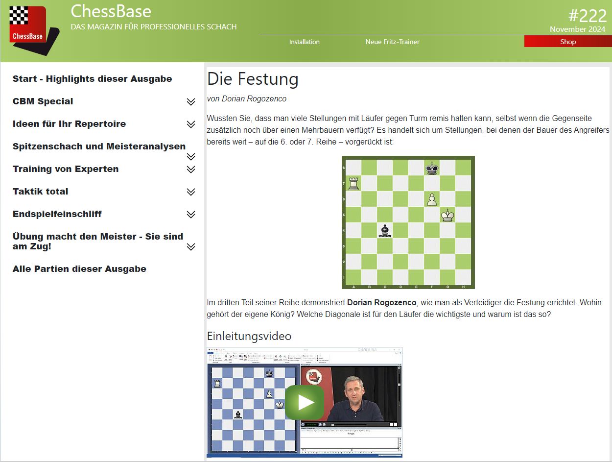 Über 6 Stunden Videospielzeit mit Felix Blohberger, Martin Breutigam, Jan Markos, Mihail Marin, Karsten Müller, Oliver Reeh, Robert Ris, Dorian Rogozenco, Jan Werle und Nico Zwirs – Schacholympiade 2024: Doppelsieg für Indien! Analysen von Abdusattorov, Aronian, Giri, So u.v.a. – „Special“: Dorian Rogozenco geht dem Geheimnis der indischen Dominanz in vier Videoanalysen auf den Grund – „All in One“ zum modernen Evans-Gambit: Tanmay Srinath seziert Carlsens Sieg über Anand nach 1.e4 e5 2.Sf3 Sc6 3.Lc4 Lc5 4.b4!? – Firouzja in Topform: Martin Breutigam spielt die Kampfparte Firouzja-Giri „Zug für Zug“ mit Ihnen durch! – „Ins Eröffnungsgras gebissen“: In Oliver Reehs Taktikkolumne mit 39 Partien und vier interaktive Videos geht es um frühe Fiaskos! – „Action in der Spanisch-Abtauschvariante“: Evgeny Postny beleuchtet 5.0–0 Lg4 6.h3 h5 7.d3 Df6 8.Sbd2 g5!? u.v.m.