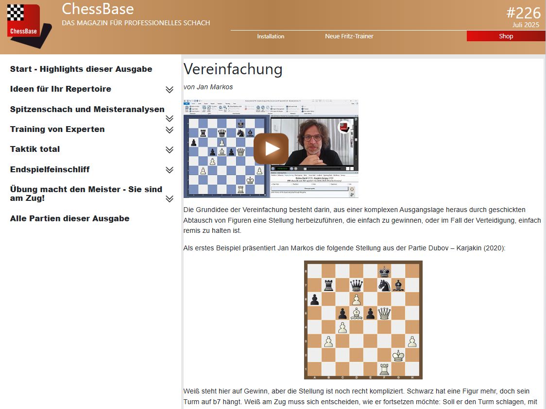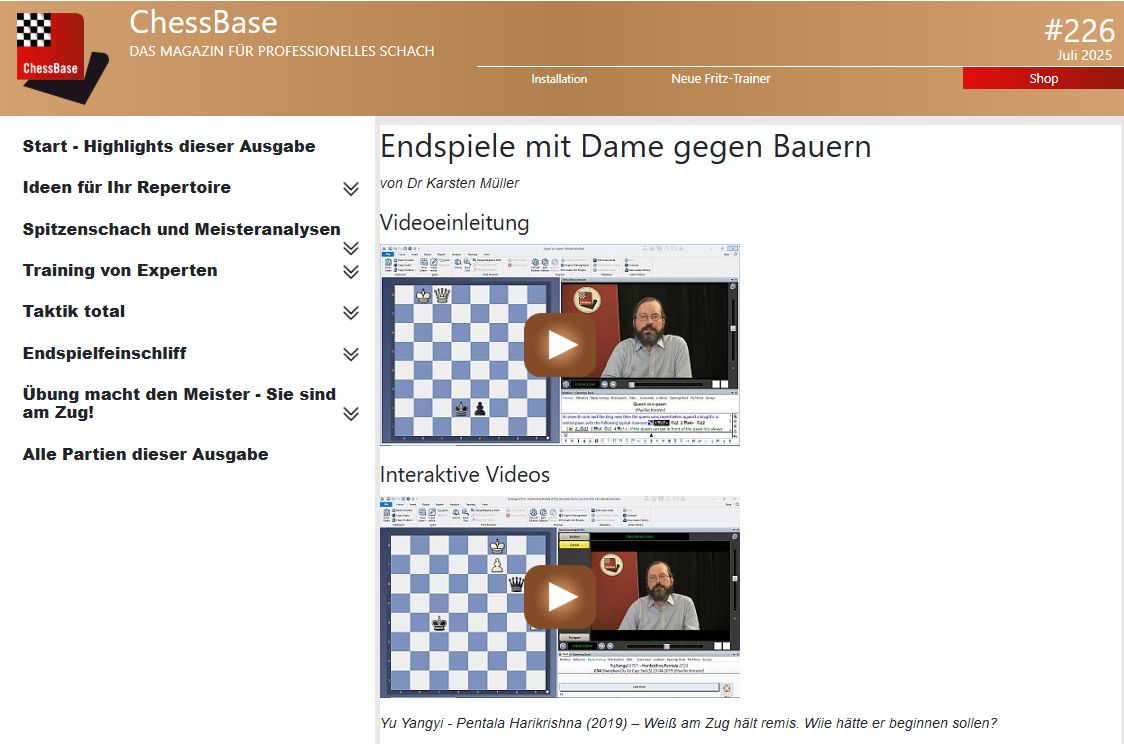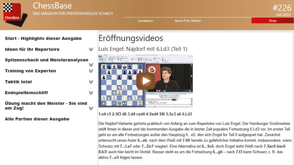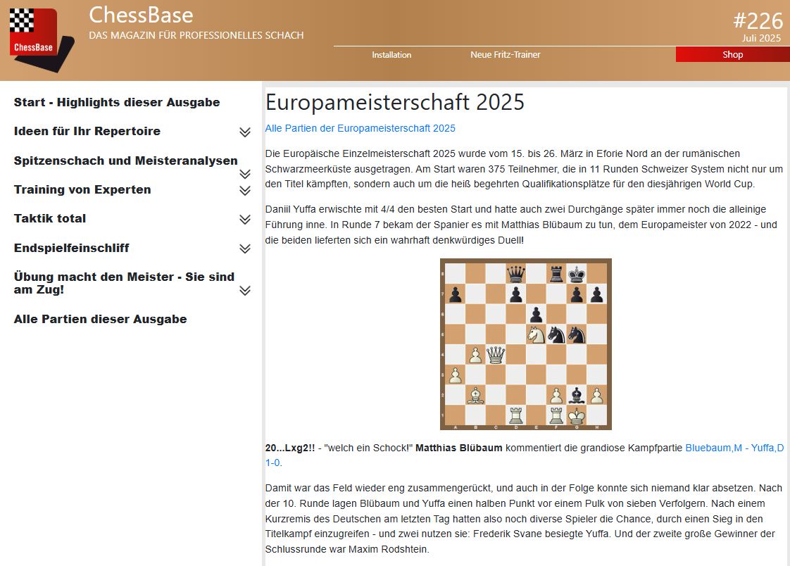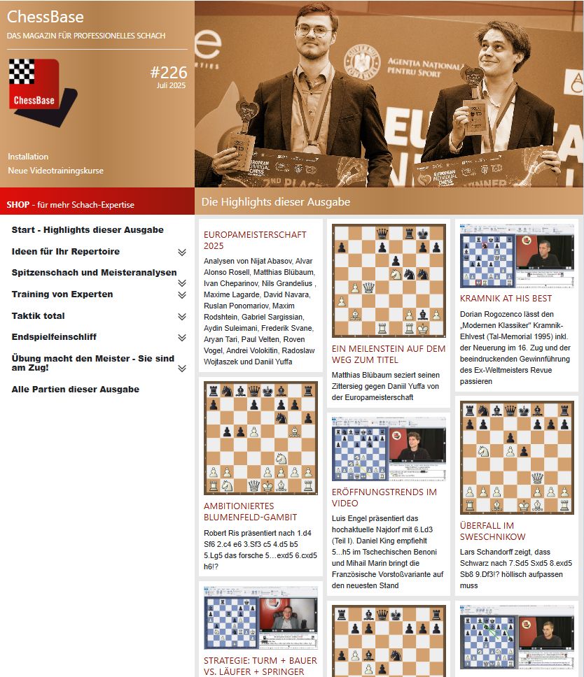 Von der Europameisterschaft 2025 über Luis Engels Eröffnungsvideo zu Najdorf mit 6.Ld3 und den neuen Praxistipp „Vereinfachung“ von Jan Markos und Oliver Reehs Taktikbeitrag "Damenopfer mit Dividende" bis zu Dr. Karsten Müllers Videoreihe "Endspiel Basiswissen".