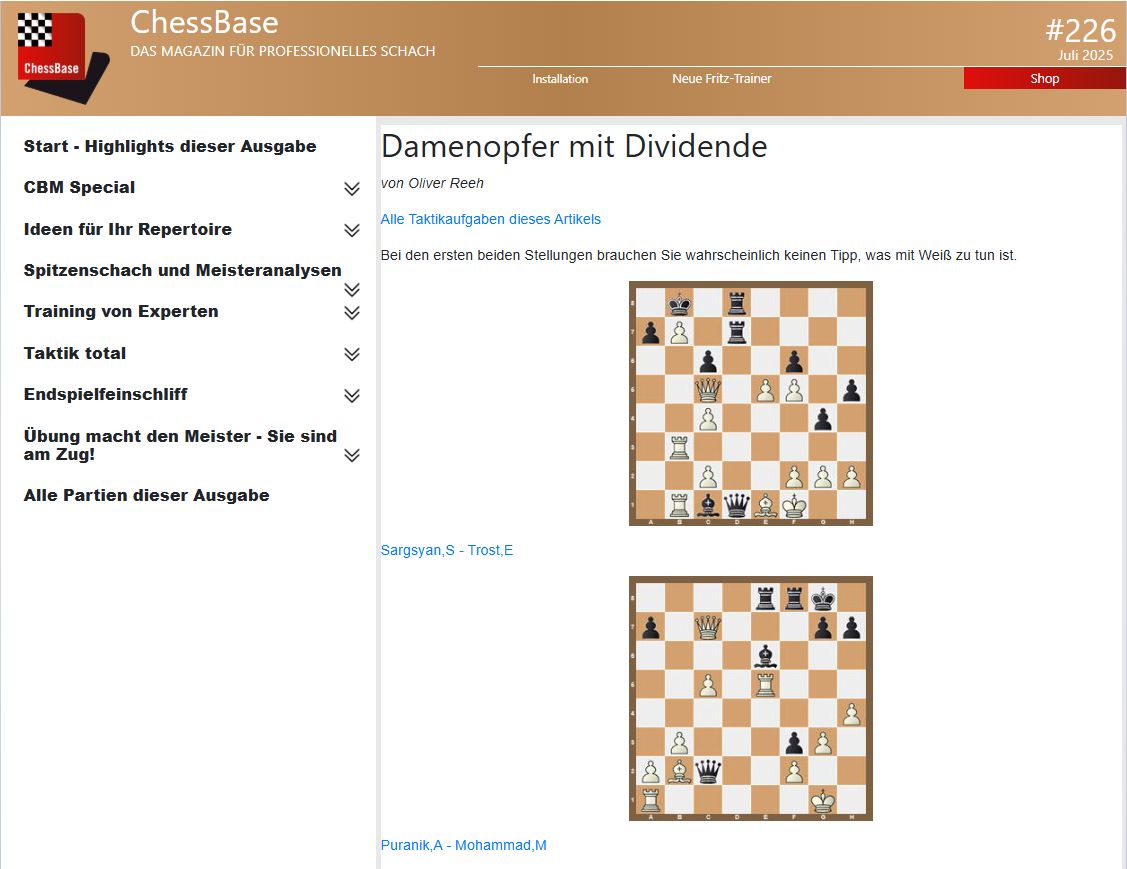 Taktik ist das A und O! Im Beitrag von Oliver Reeh mit 35 Partien und über 100 Trainingsfragen ist oft mutiges Spiel mit der Dame gefragt. Die vier Lieblingskombinationen unseres Autors lösen Sie Zug für Zug im interaktiven Videoformat!