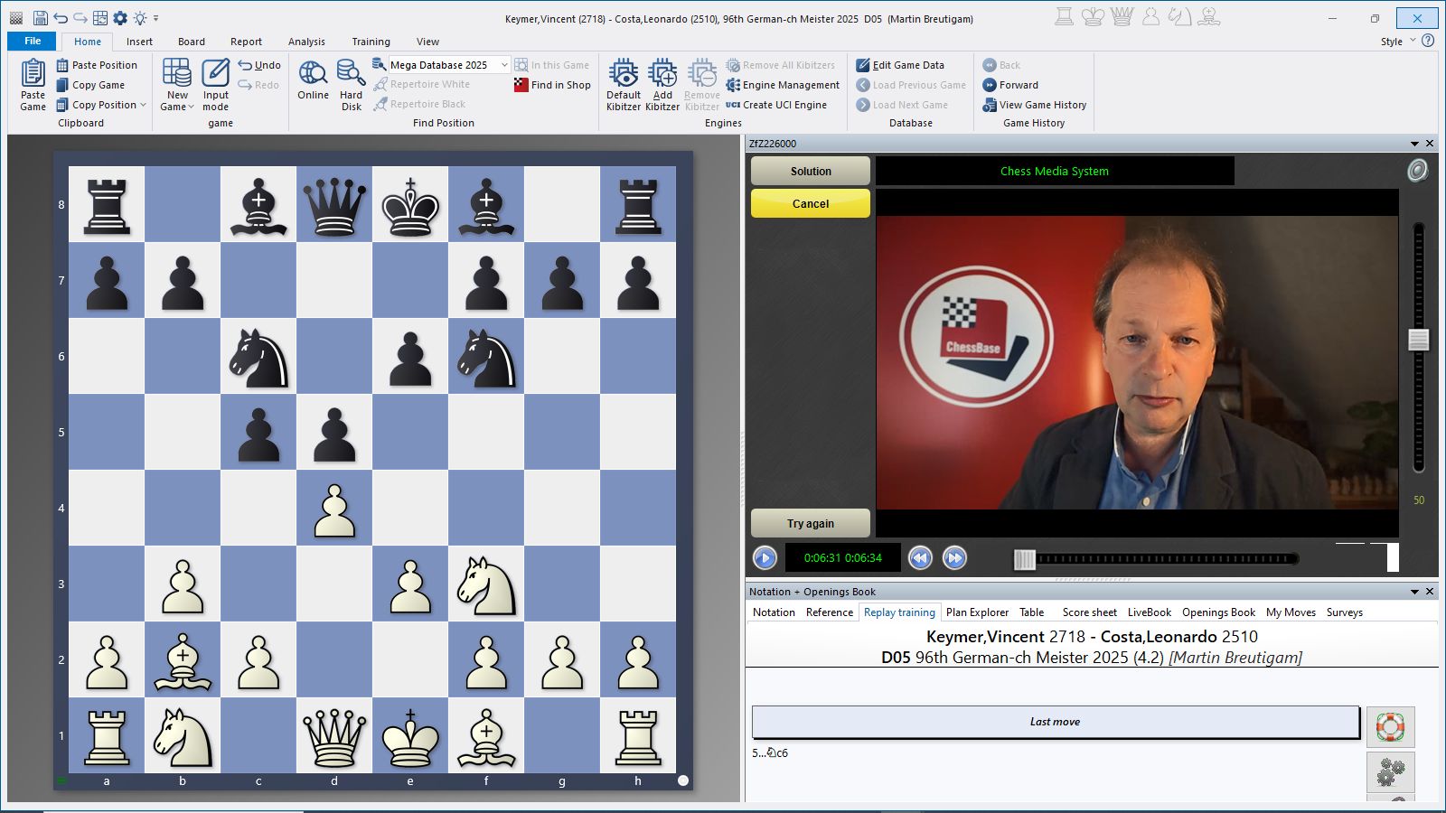 Vincent Keymer ließ der Konkurrenz bei der Deutschen Meisterschaft 2025 keine Chance. Martin Breutigam geht mit Ihnen exemplarisch die Partie Keymer gegen Costa durch. Eine kleine taktische Unachtsamkeit seines Gegners reichte dem neuen Deutschen Meister, um die Partie im technischen Teil mühelos zum Sieg zu führen.