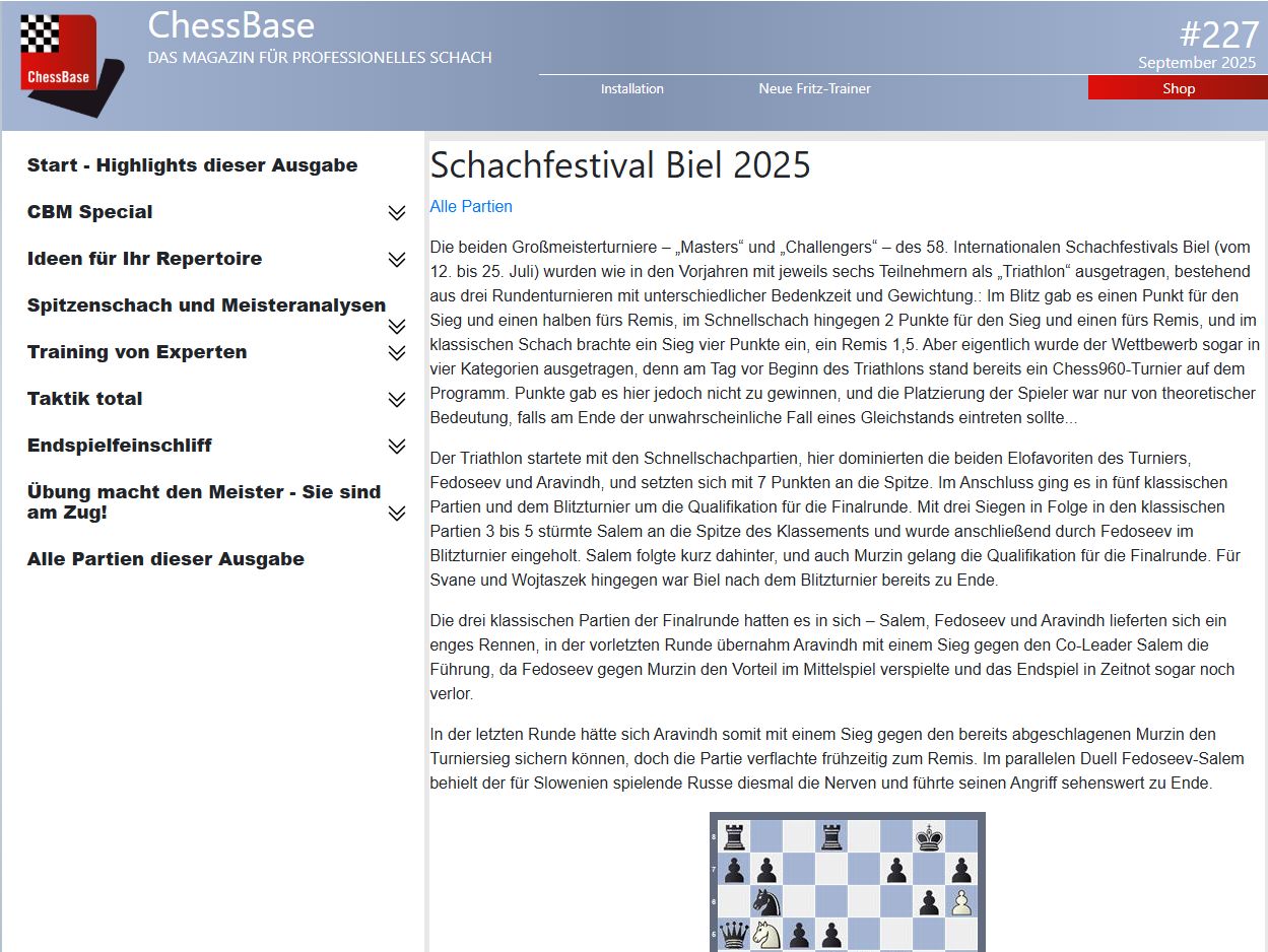 Vom Schachfestival Biel 2025 über Felix Blohbergers Eröffnungsvideo zum „Dubov-Drachen“ und Oliver Reehs Taktikbeitrag "Qualitätsopfer, Harry und mehr“ bis zu Dr. Karsten Müllers Videoreihe "Endspiel Basiswissen".