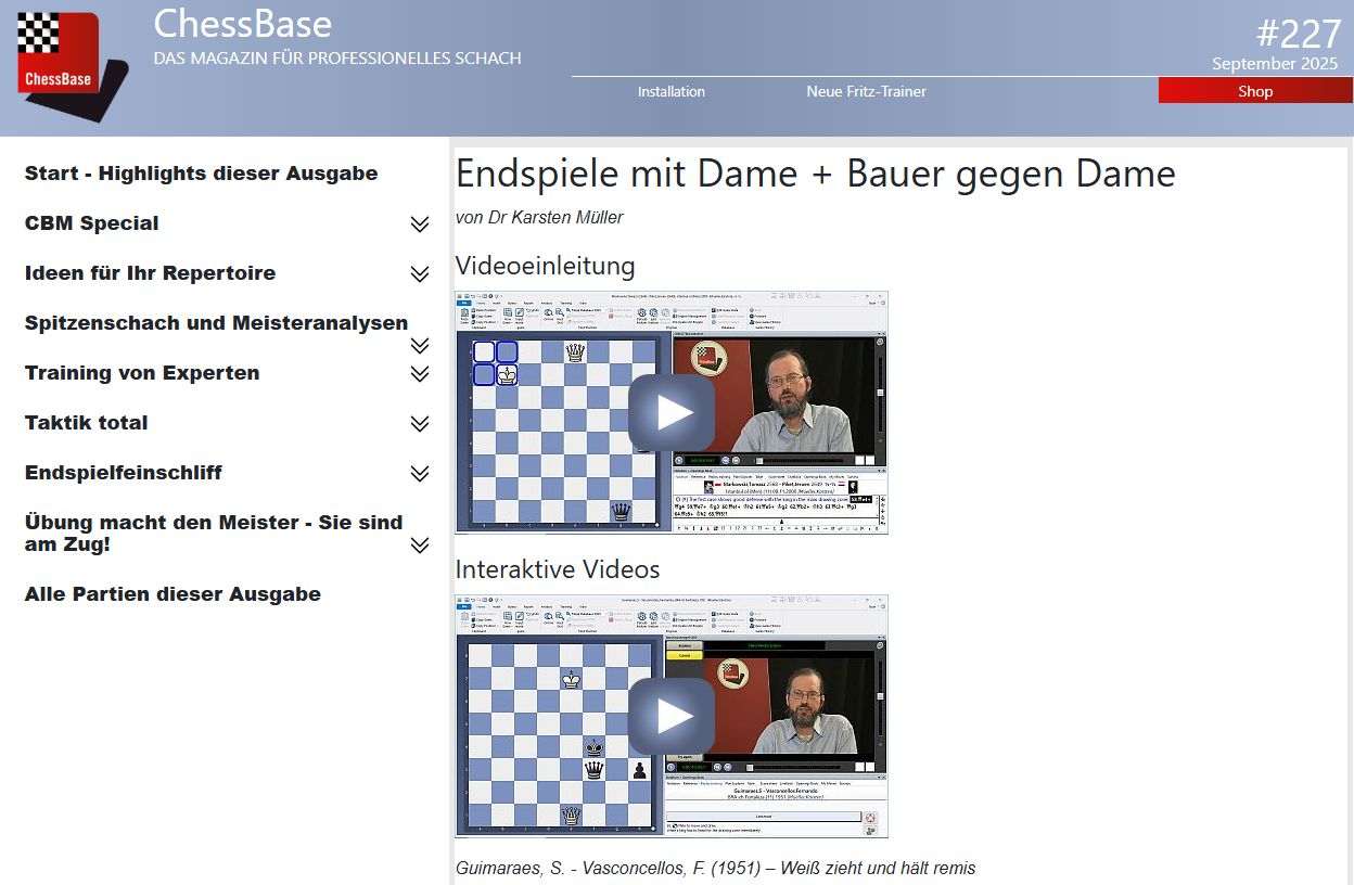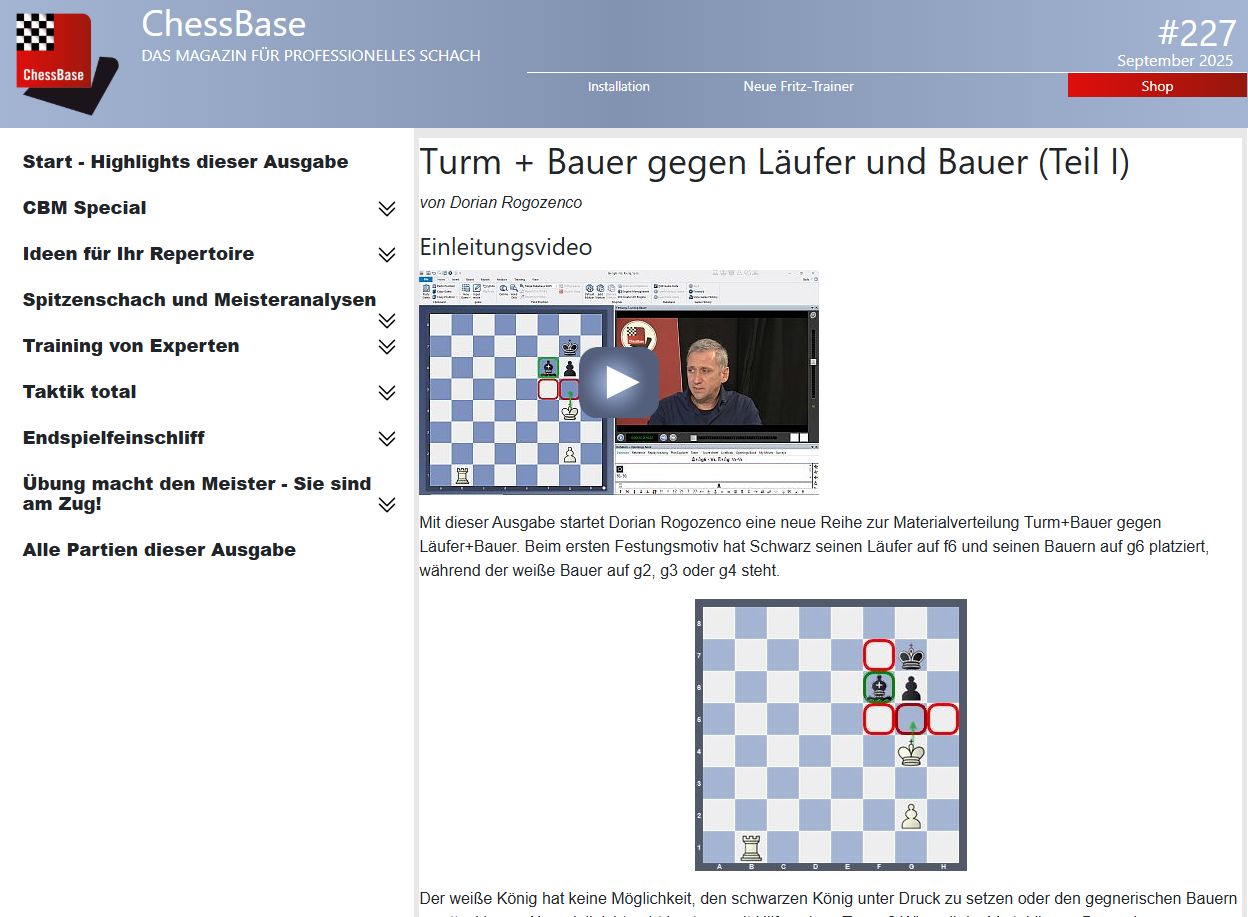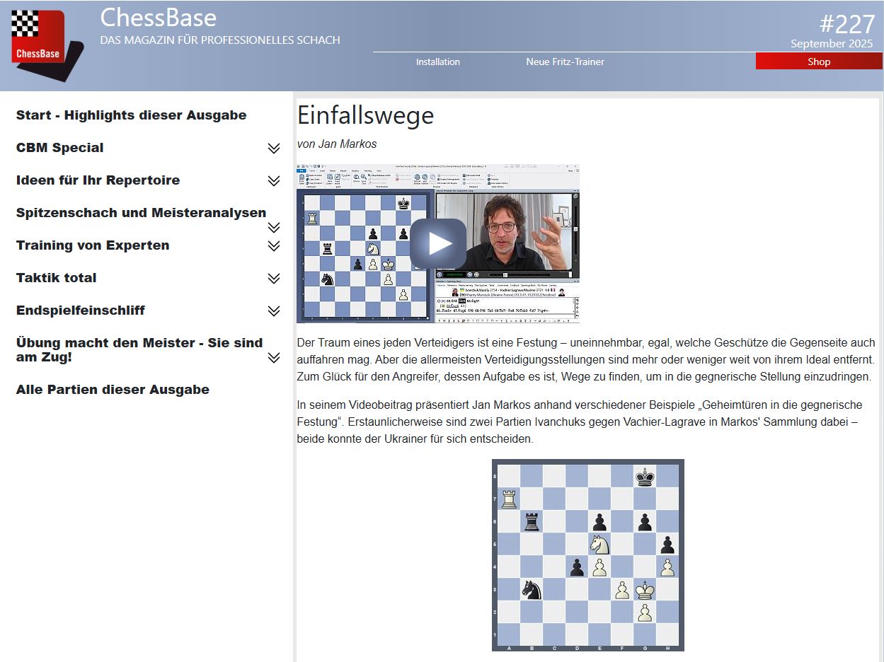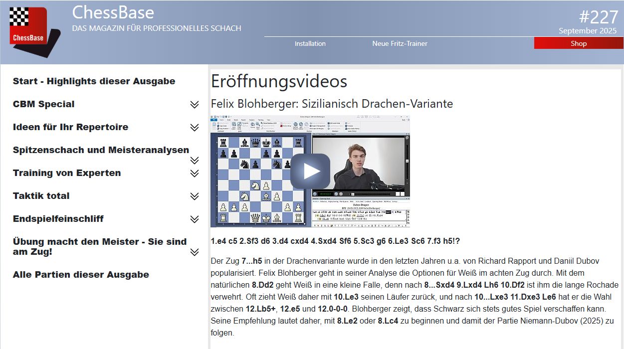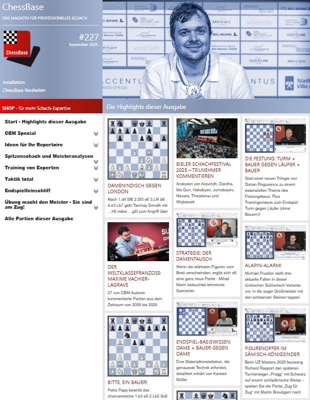 Über 7 Stunden Video-Spielzeit mit Felix Blohberger, Martin Breutigam, Luis Engel Jan Markos, Mihail Marin, Dr. Karsten Müller, Michael Prusikin, Oliver Reeh, Robert Ris, Dorian Rogozenco und Ivan Sokolov – Biel 2025: Analysen von Aravindh, Dardha, Ma Qun, Hakobyan, Jumabayev, Navara, Theodorou und Wojtaszek – Perfektes Angrifsspiel: Dorian Rogozenco zeigt den „Modernen Klassiker“ Kasparov vs. Kramnik (Novgorod 1994), in der der Weltmeister in der Sweschnikow-Variante ein neues Konzept mit 15.Dd2 und langer Rochade anwandte – Aggressiver Sizilianer: Yago Santiago agiert mit 1.e4 c5 2.Sf3 e6 3.d4 cxd4 4.Sxd4 Sc6 5.Sc3 Lc5!? auf den schwarzen Feldern – Eröffnungstrends im Video: Sizilianisch Drachen-Variante, Slawische Verteidigung und Sizilianisch Najdorf-Variante – Endspiel Basiswissen Dame + Bauer gegen Dame: Eine Materialkonstellation, die genaueste Technik erfordert, detailliert erklärt von Karsten Müller u.v.m.