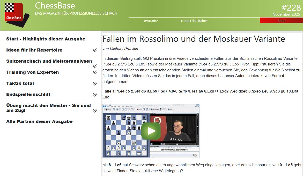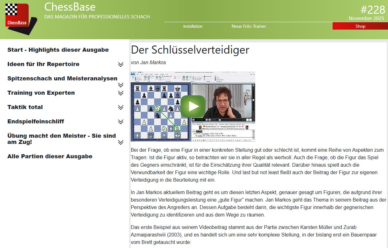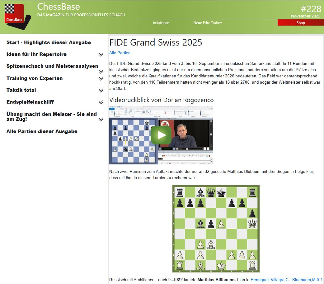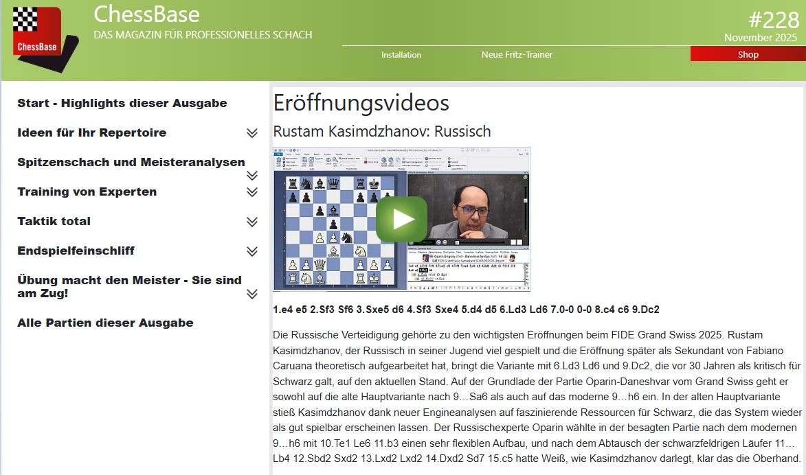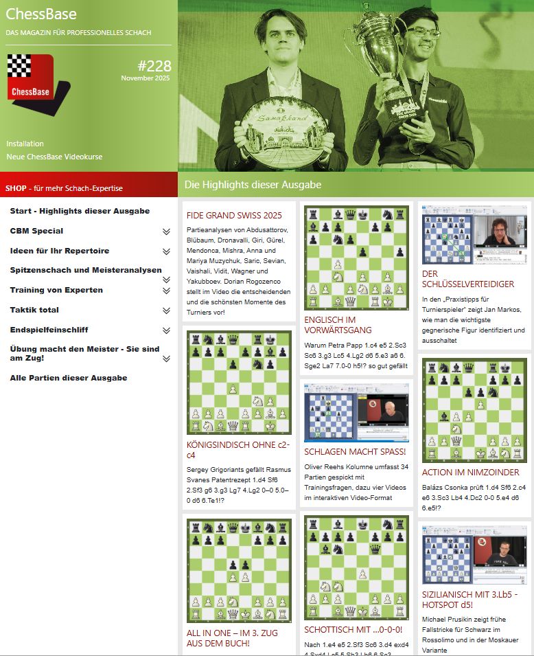 Über 7 Stunden Video-Spielzeit mit Felix Blohberger, Martin Breutigam, Rustam Kasimdzhanov, Jan Markos, Mihail Marin, Dr. Karsten Müller, Michael Prusikin, Oliver Reeh, Robert Ris, Dorian Rogozenco und Ivan Sokolov – FIDE Grand Swiss 2025: Analysen von Giri, Blübaum, Vaishali, Abdusattorov, Mishra, Vidit u.v.a. – Die Doppelblockade: Mihail Marin beleuchtet Szenarien, in denen es vorteilhaft ist, Freibauern durch Springer und Läufer zu hemmen – Action im Nimzoinder: Balázs Csonka prüft 1.d4 Sf6 2.c4 e6 3.Sc3 Lb4 4.Dc2 0-0 5.e4 d6 6.e5!? – Der Schlüsselverteidiger: In den „Praxistipps für Turnierspieler“ zeigt Jan Markos, wie man die wichtigste gegnerische Figur identifiziert und ausschaltet – All in One – im 3. Zug aus dem Buch: Romain Edouard war selbst verblüfft, wie gut 1.e4 e6 2.d4 d5 3.Sd2 e5!? Funktioniert u.v.m.