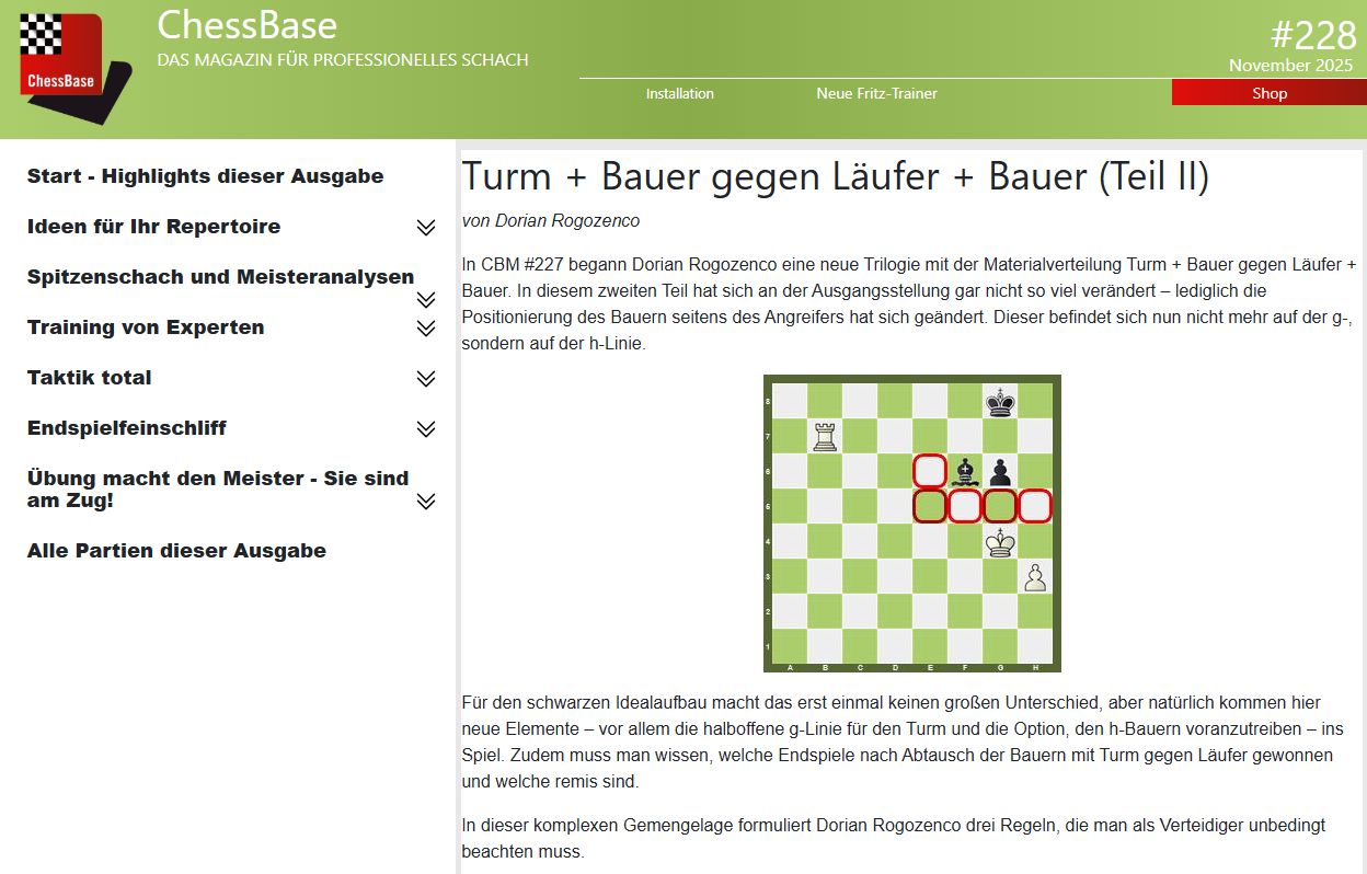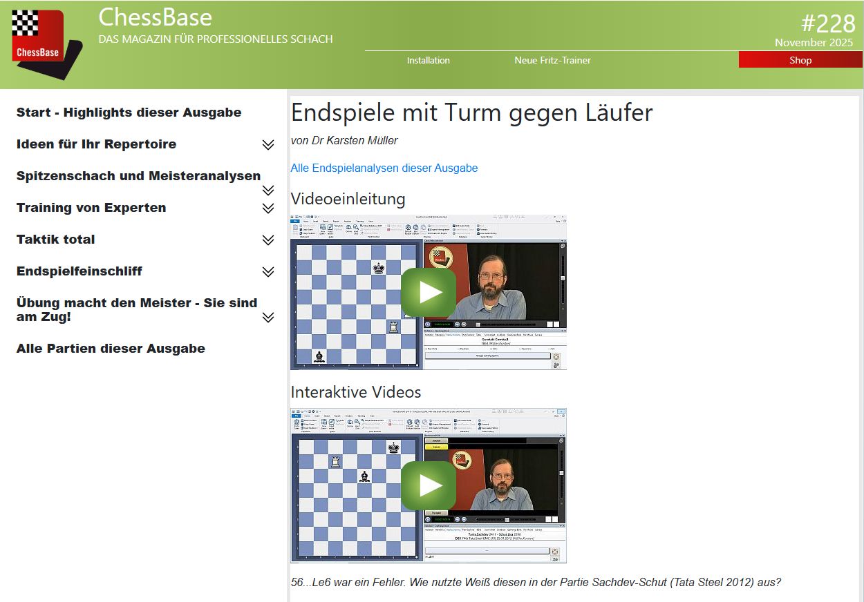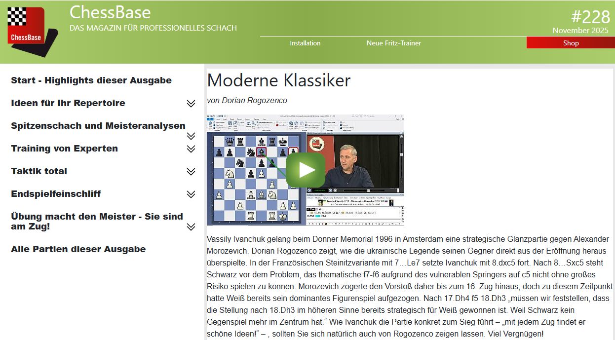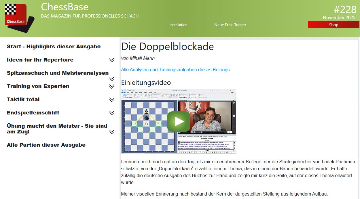 Über 7 Stunden Video-Spielzeit mit Felix Blohberger, Martin Breutigam, Rustam Kasimdzhanov, Jan Markos, Mihail Marin, Dr. Karsten Müller, Michael Prusikin, Oliver Reeh, Robert Ris, Dorian Rogozenco und Ivan Sokolov – FIDE Grand Swiss 2025: Analysen von Giri, Blübaum, Vaishali, Abdusattorov, Mishra, Vidit u.v.a. – Die Doppelblockade: Mihail Marin beleuchtet Szenarien, in denen es vorteilhaft ist, Freibauern durch Springer und Läufer zu hemmen – Action im Nimzoinder: Balázs Csonka prüft 1.d4 Sf6 2.c4 e6 3.Sc3 Lb4 4.Dc2 0-0 5.e4 d6 6.e5!? – Der Schlüsselverteidiger: In den „Praxistipps für Turnierspieler“ zeigt Jan Markos, wie man die wichtigste gegnerische Figur identifiziert und ausschaltet – All in One – im 3. Zug aus dem Buch: Romain Edouard war selbst verblüfft, wie gut 1.e4 e6 2.d4 d5 3.Sd2 e5!? Funktioniert u.v.m.