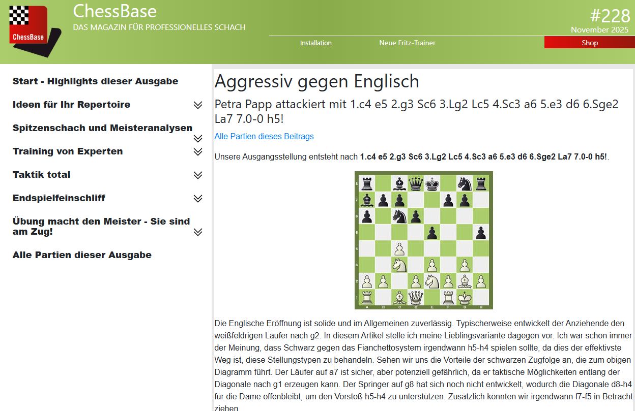 Von Englisch bis Königsindisch – das ChessBase Magazin #228 bietet 10 Eröffnungsartikel mit neuen Anregungen für jeden ambitionierten Spieler: