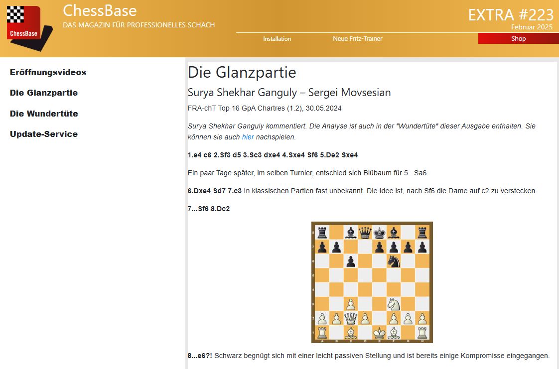 Surya Ganguly, der im kommenden CBM #224 eine umfangreiche Videoanalyse zu Sizilianisch mit 2…e6 3.d4 exd4 4.Dxd4 liefern wird, steuert „Die Glanzpartie“ der Ausgabe bei – eine fulminante Angriffspartie gegen Sergei Movsesian aus der Französischen Liga 2024, in der Schwarz bereits nach seinem 14. Zug auf verlorenem Posten stand: „14...Dd5? Nach diesem Zug gab es keine Chance mehr, die Partie zu retten.“