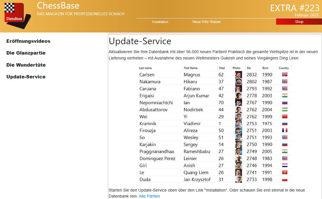 Die Partien des Update-Service sind auch im Mega-Update-Service 2025 enthalten, den man mit den Programmen ChessBase 17/18 (und einem entsprechendem Abonnement) nutzen kann.