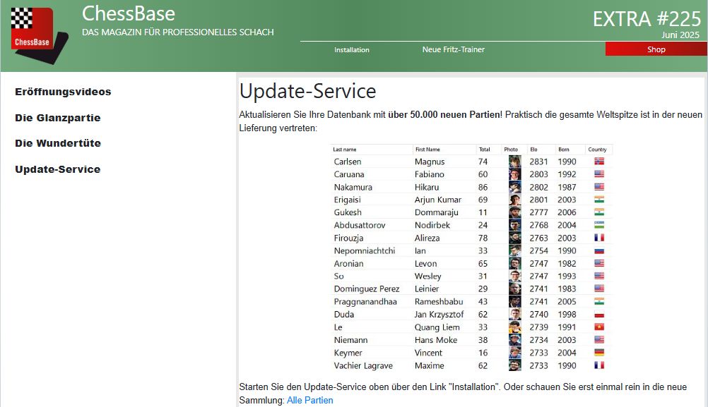 Die Partien des Update-Service sind auch im Mega-Update-Service 2025 enthalten, den man mit den Programmen ChessBase 17/18 (und einem entsprechendem Abonnement) nutzen kann.