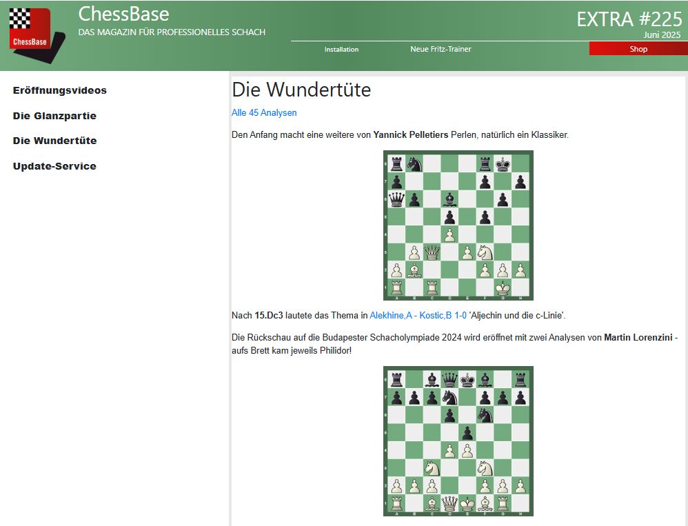 Das Extra #225 liefert in der „Wundertüte“ 45 kommentierte Partien aus verschiedensten Turnieren.