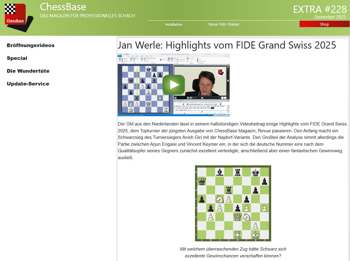 ChessBase Magazin Extra ist die perfekte Ergänzung zum ChessBase Magazin. Erhältlich als Einzelausgabe oder im Abonnement (6 Ausgaben pro Jahr). Erhältlich als direkter Download.