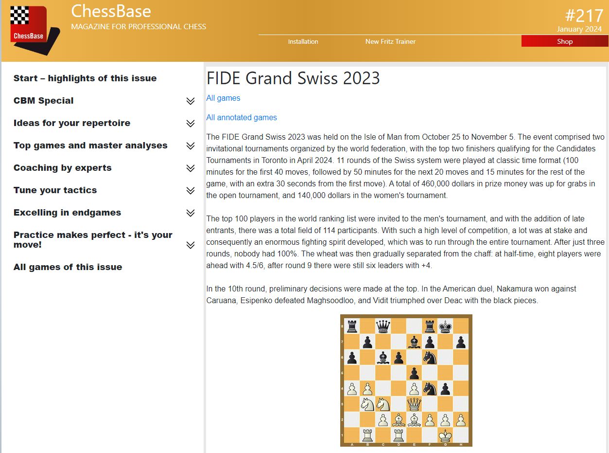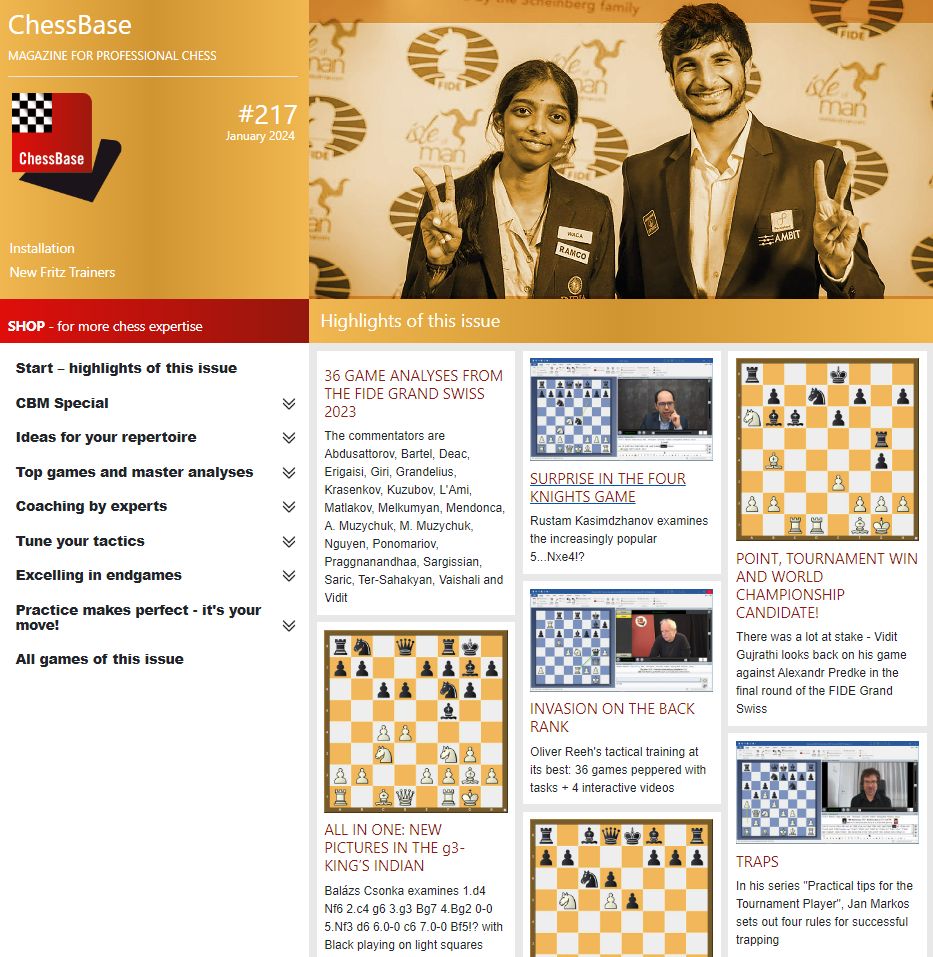 FIDE Grand Swiss 2023: Vidit Gujrathi's winning game against Alexandr Predke in the final round secured him the tournament victory and thus - like runner-up Hikaru Nakamura - qualification for the 2024 Candidates Tournament. In this issue you will find analyses by Vidit as well as Abdusattorov, Bartel, Deac, Erigaisi, Giri, Grandelius, Krasenkov, Kuzubov, L'Ami, Matlakov, Melkumyan, Mendonca, A. Muzychuk, M. Muzychuk, Nguyen, Ponomariov, Praggnanandhaa, Sargissian, Saric, Ter-Sahakyan and Vaishali, the winner of the women's Grand Swiss 2023.