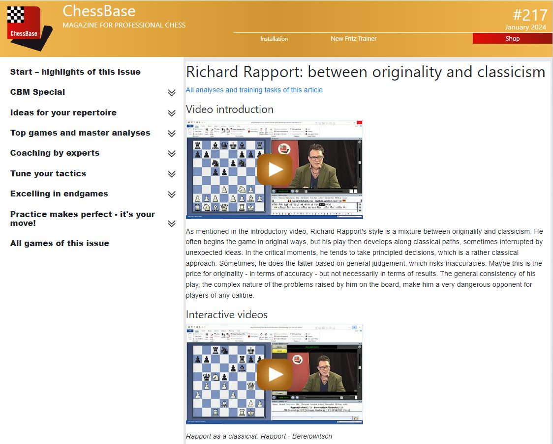 The Hungarian number one is considered one of the most creative players of our time. Mihail Marin has analysed Richard Rapport's style in detail. In three Fritztrainer videos and numerous analyses, he characterises him as a mixture of originality and classicism.