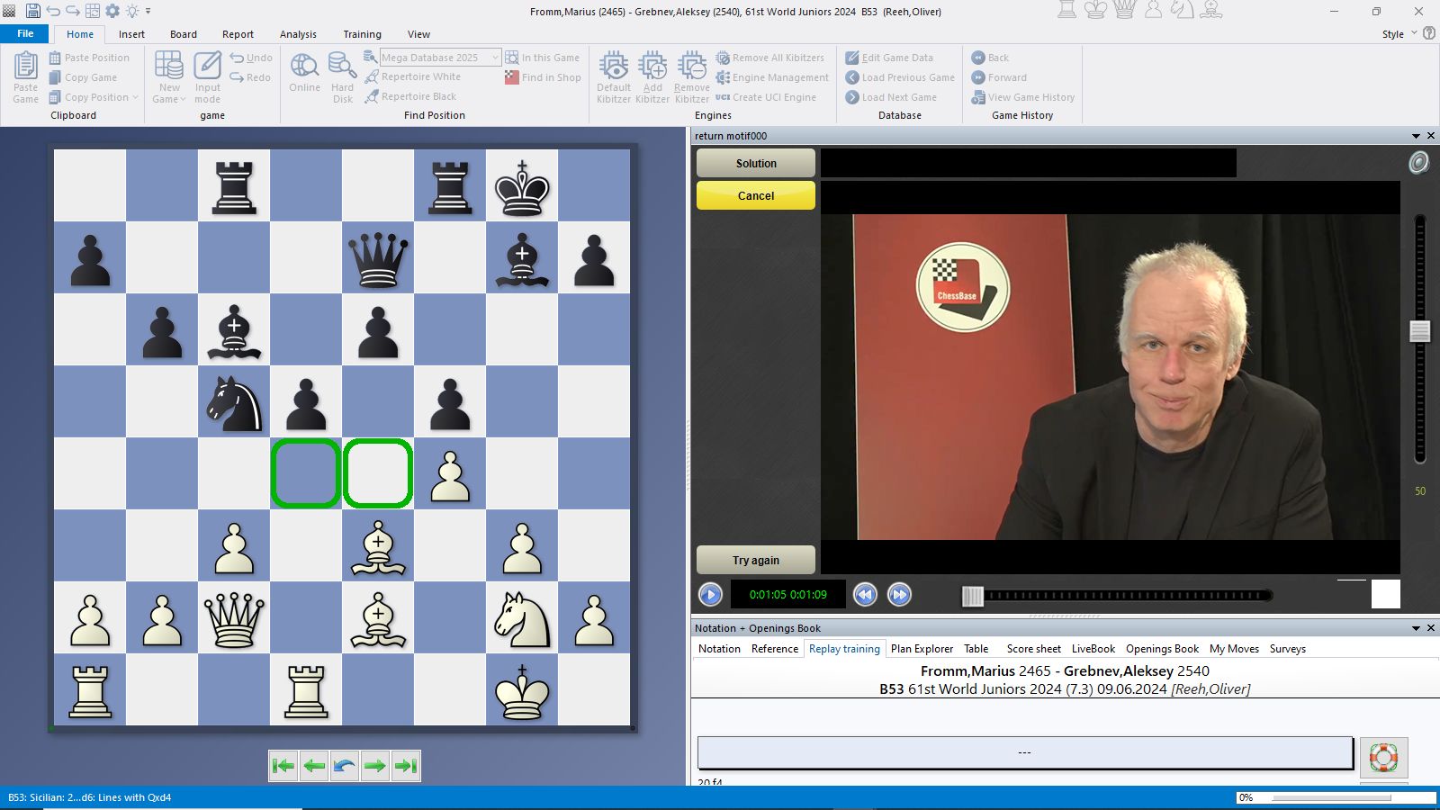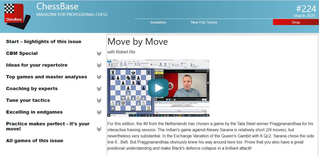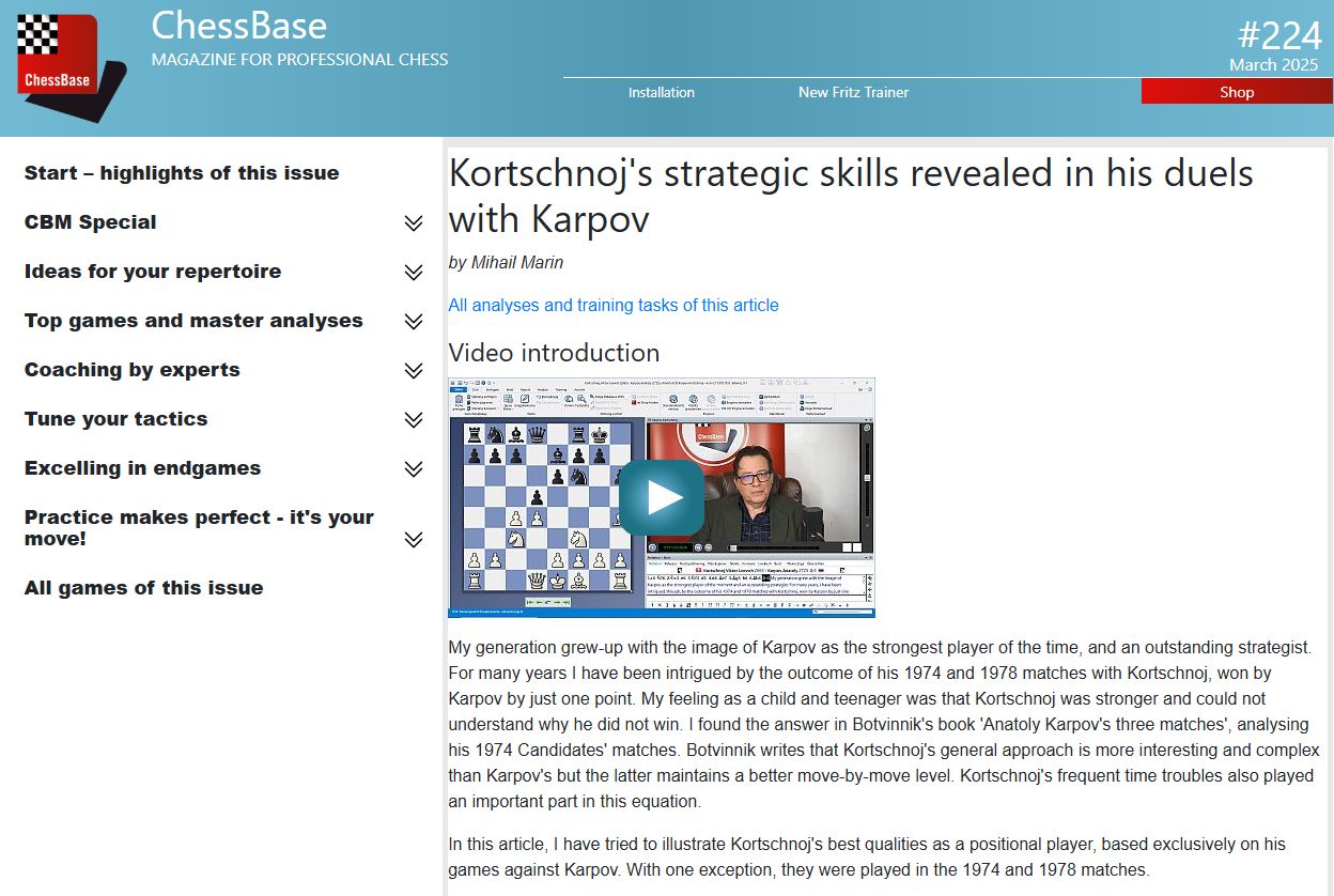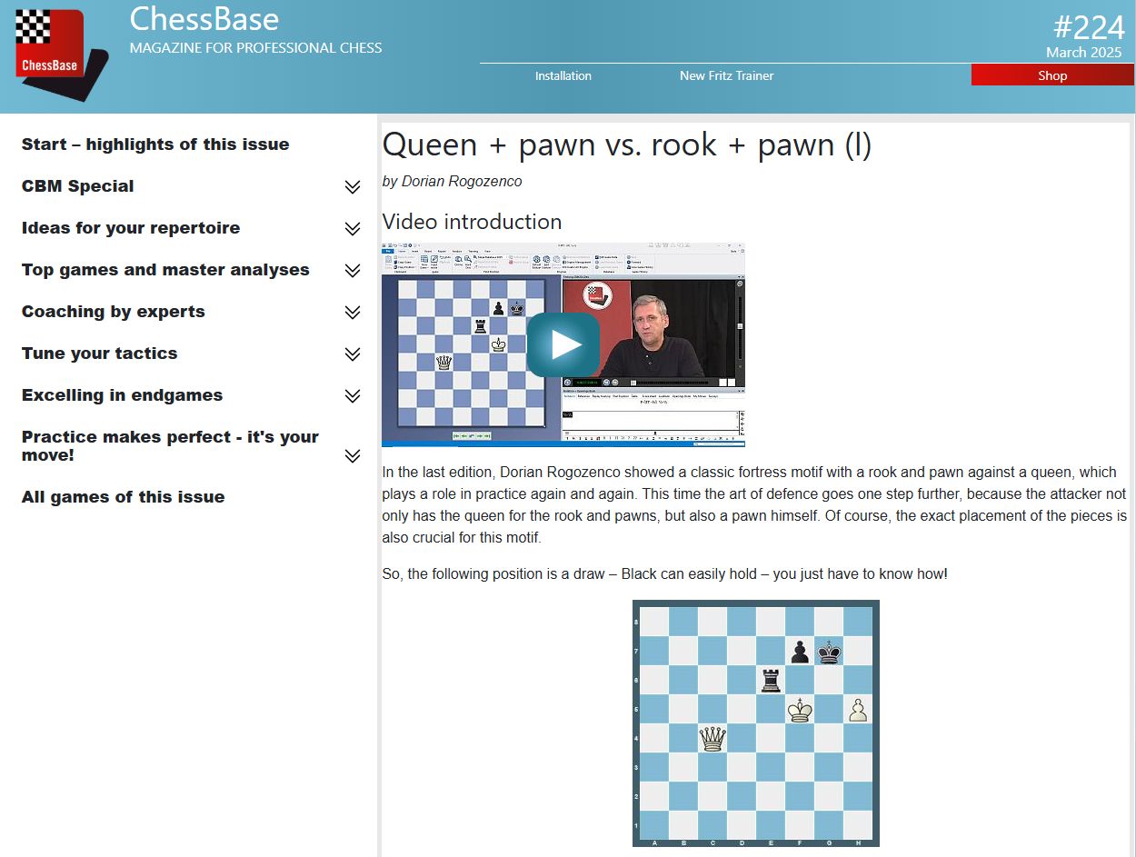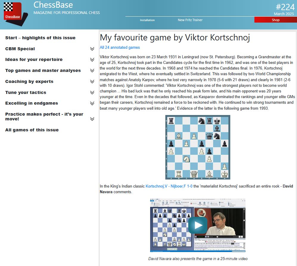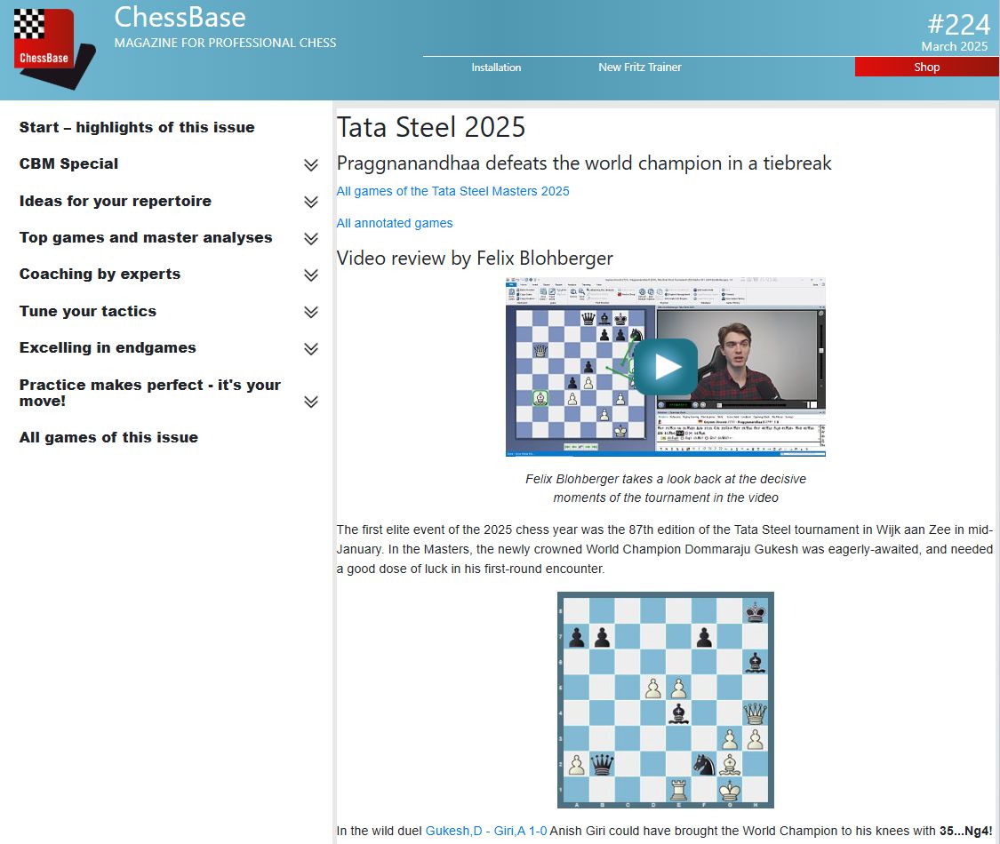 Over 7 hours of video playing time with Felix Blohberger, Surya Ganguly, Daniel King, Jan Markos, Karsten Mueller, Oliver Reeh, Robert Ris and Dorian Rogozenco – Tata Steel 2025: Analyses by the tournament winners, Praggnanandhaa and Nguyen, as well as Abdusattorov, Giri, Harikrishna, L'Ami, Mendonca, Suleymanli, Van Foreest and Yakubboev + video review by Blohberger - Chess legend Viktor Kortschnoj: exclusive collection of 24 annotated games from 1960 to 2006 plus video by David Navara – Modern Petroff: Balázs Csonka sheds light on the Damiano Variation 1.e4 e5 2.Nf3 Nf6 3.Nxe5 Nxe4!? - “The fortress - rien ne va plus!”: Dorian Rogozenco shows a classic fortress motif with queen + pawn against rook + pawn - The cheeky queen: Surya Ganguly shows in the video that 4.Qxd4 is also an option against the Sicilian with 2...e6! and much more.