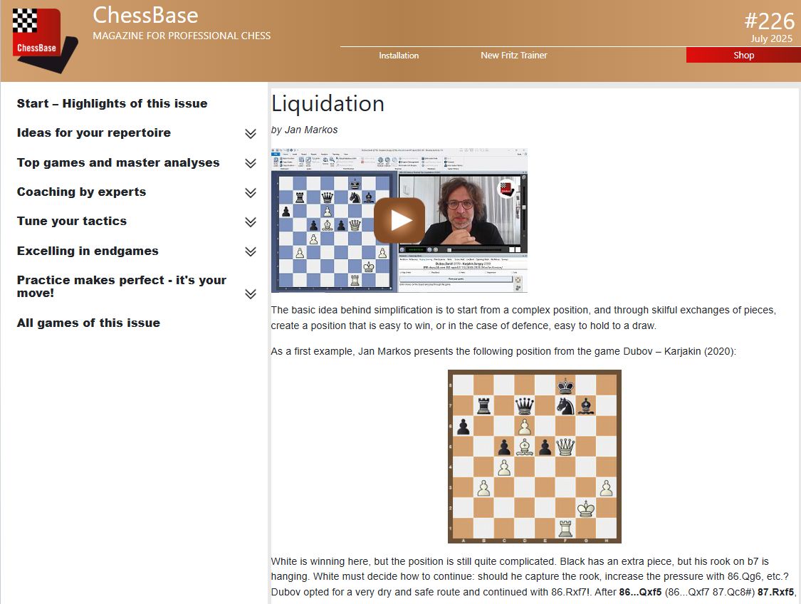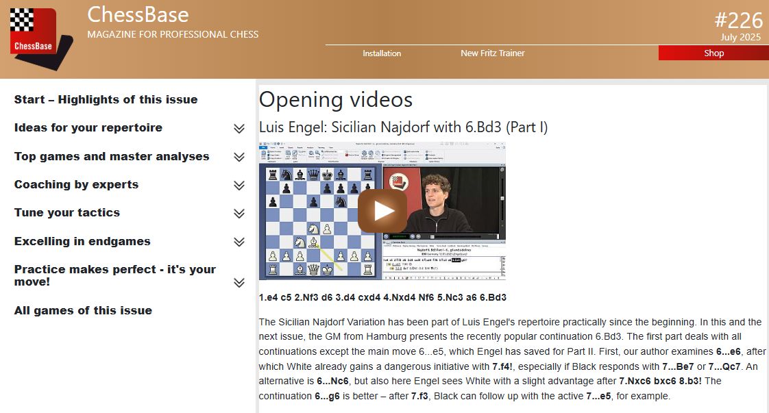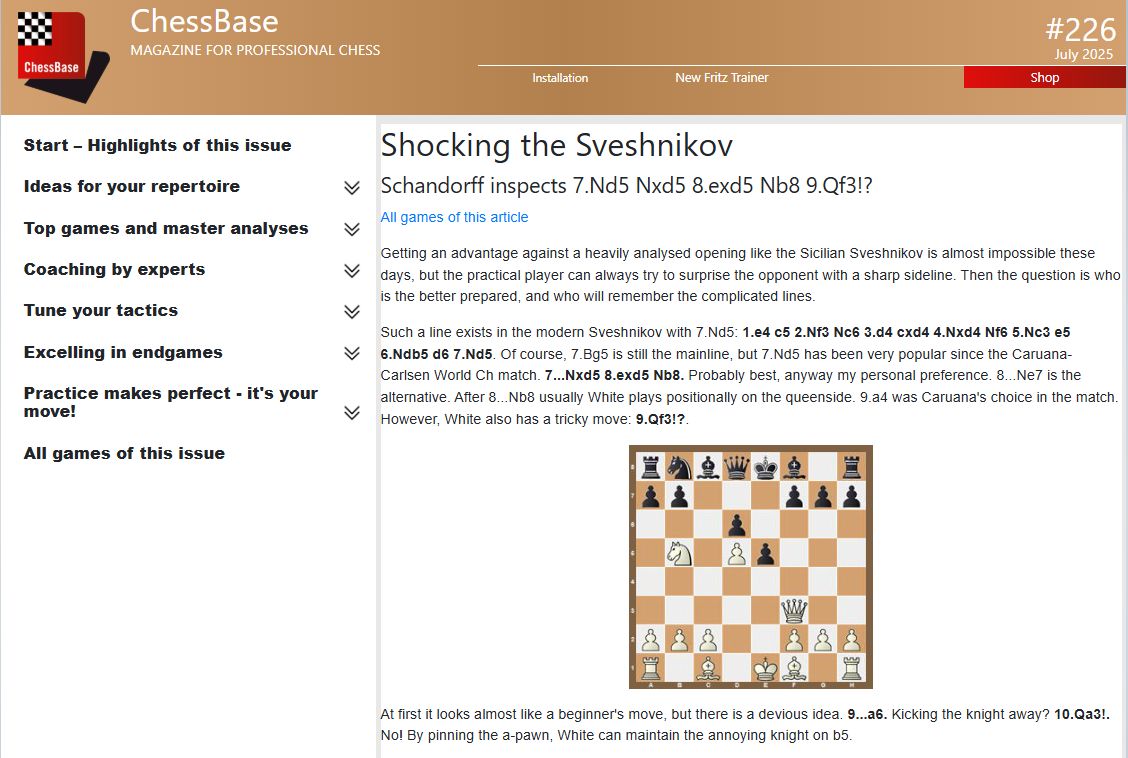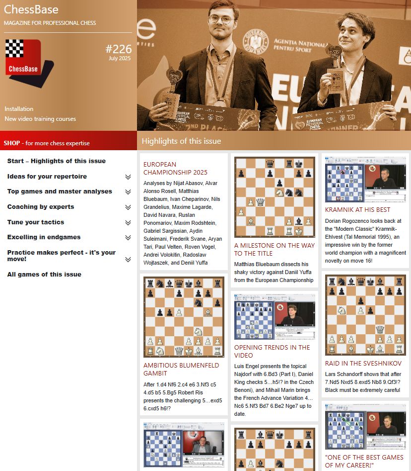 Over 7 hours of video playing time with Frederik Svane, Martin Breutigam, Daniel King, Luis Engel Jan Markos, Mihail Marin, Dr Karsten Müller, Michael Prusikin, Oliver Reeh, Robert Ris and Dorian Rogozenco – European Championship 2025: Analyses by Bluebaum, F. Svane, Abasov, Alonso Rosell, Cheparinov, Grandelius, Lagarde, Navara, Ponomariov, Rodshtein, Sargissian, Suleymanli, Tari, Velten, Vogel, Volokitin, Wojtaszek and Yuffa – Raid in the Sveshnikov: Lars Schandorff shows that Black has to be extremely careful after 7.Nd5 Nxd5 8.exd5 Nb8 9.Qf3!? – ‘Queen sacrifice with dividend’: Oliver Reeh's tactical tests with over 30 current games + four interactive videos – Kramnik at his best: Dorian Rogozenco reviews the ‘Modern Classic’ Kramnik-Ehlvest (Tal Memorial 1995), including the novelty in move 16 and the impressive play by the former world champion, and much more.