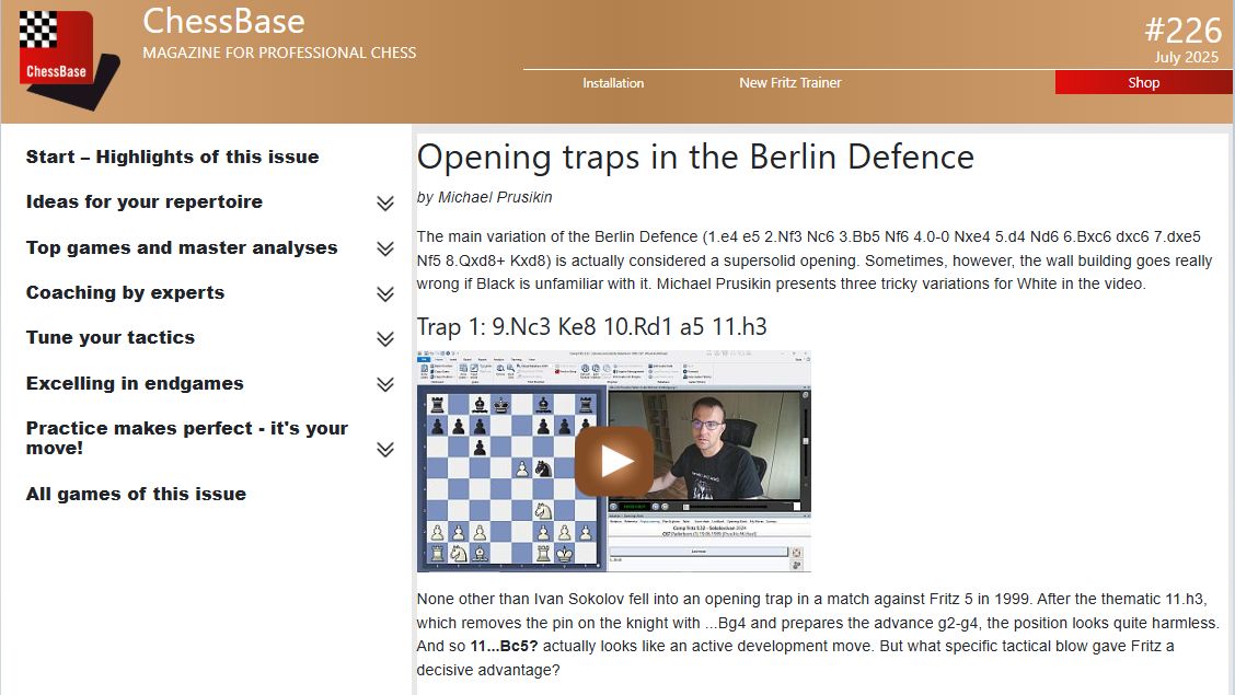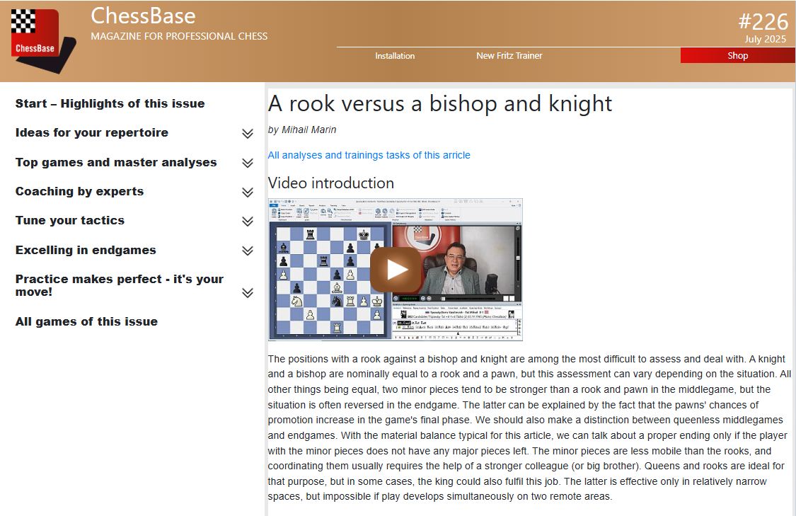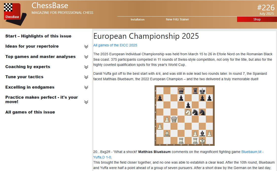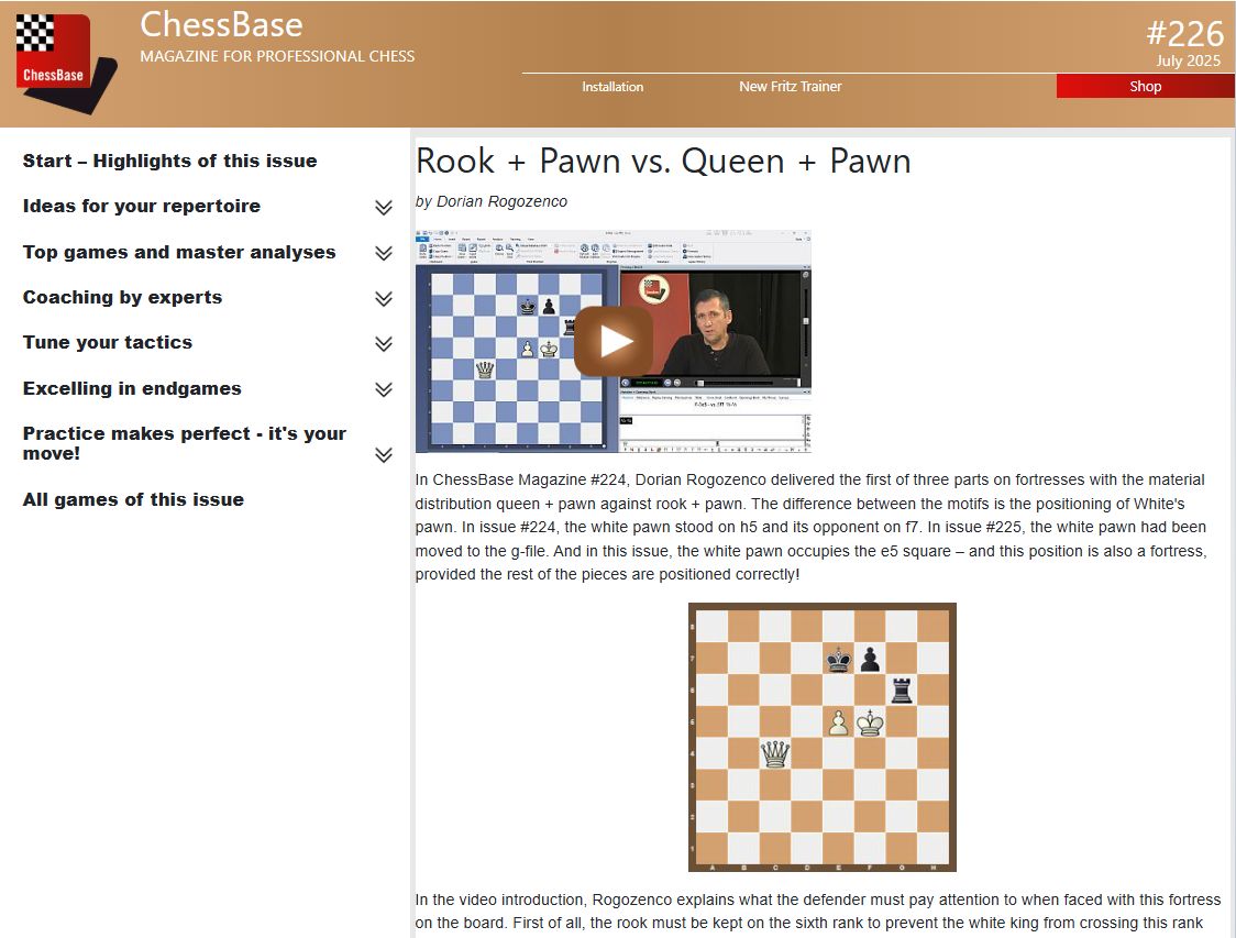Over 7 hours of video playing time with Frederik Svane, Martin Breutigam, Daniel King, Luis Engel Jan Markos, Mihail Marin, Dr Karsten Müller, Michael Prusikin, Oliver Reeh, Robert Ris and Dorian Rogozenco – European Championship 2025: Analyses by Bluebaum, F. Svane, Abasov, Alonso Rosell, Cheparinov, Grandelius, Lagarde, Navara, Ponomariov, Rodshtein, Sargissian, Suleymanli, Tari, Velten, Vogel, Volokitin, Wojtaszek and Yuffa – Raid in the Sveshnikov: Lars Schandorff shows that Black has to be extremely careful after 7.Nd5 Nxd5 8.exd5 Nb8 9.Qf3!? – ‘Queen sacrifice with dividend’: Oliver Reeh's tactical tests with over 30 current games + four interactive videos – Kramnik at his best: Dorian Rogozenco reviews the ‘Modern Classic’ Kramnik-Ehlvest (Tal Memorial 1995), including the novelty in move 16 and the impressive play by the former world champion, and much more.