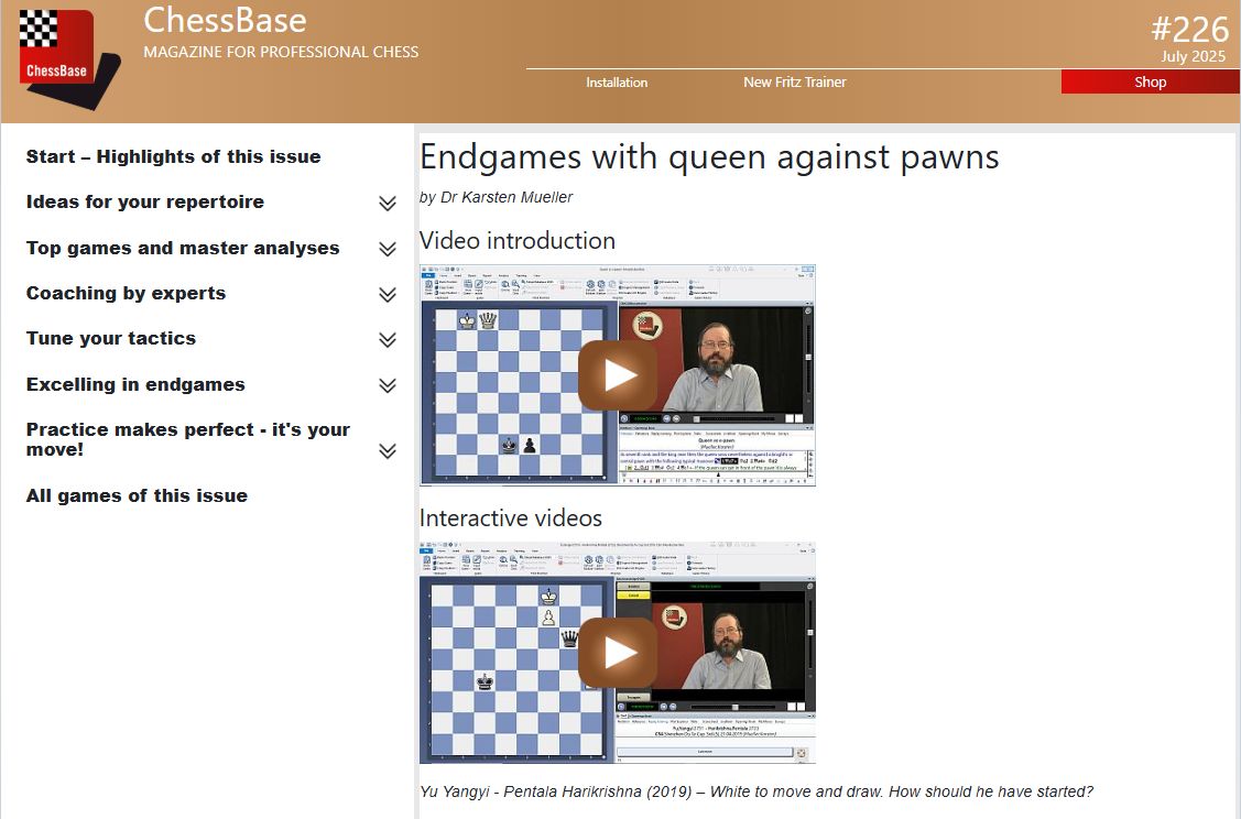 From the 2025 European Championship to Luis Engel's opening video on the Najdorf with 6.Bd3 and the new practical tip ‘Liquidation’ by Jan Markos and Oliver Reeh's tactical contribution ‘Queen sacrifice with dividend’ to Dr. Karsten Mueller's video series ‘Fundamental Endgame Knowledge’.