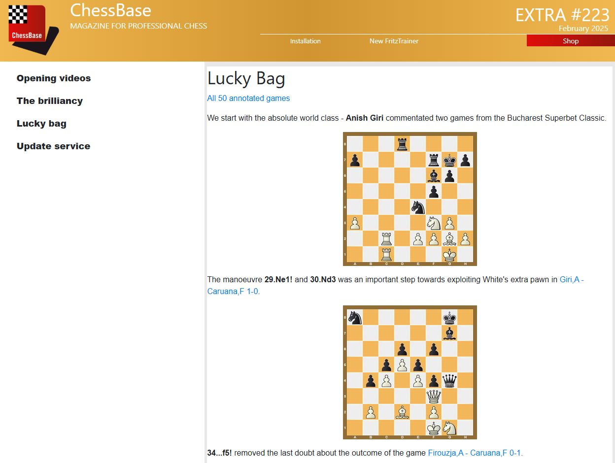 Extra #223 provides 50 annotated games from various tournaments in the “Lucky bag”.