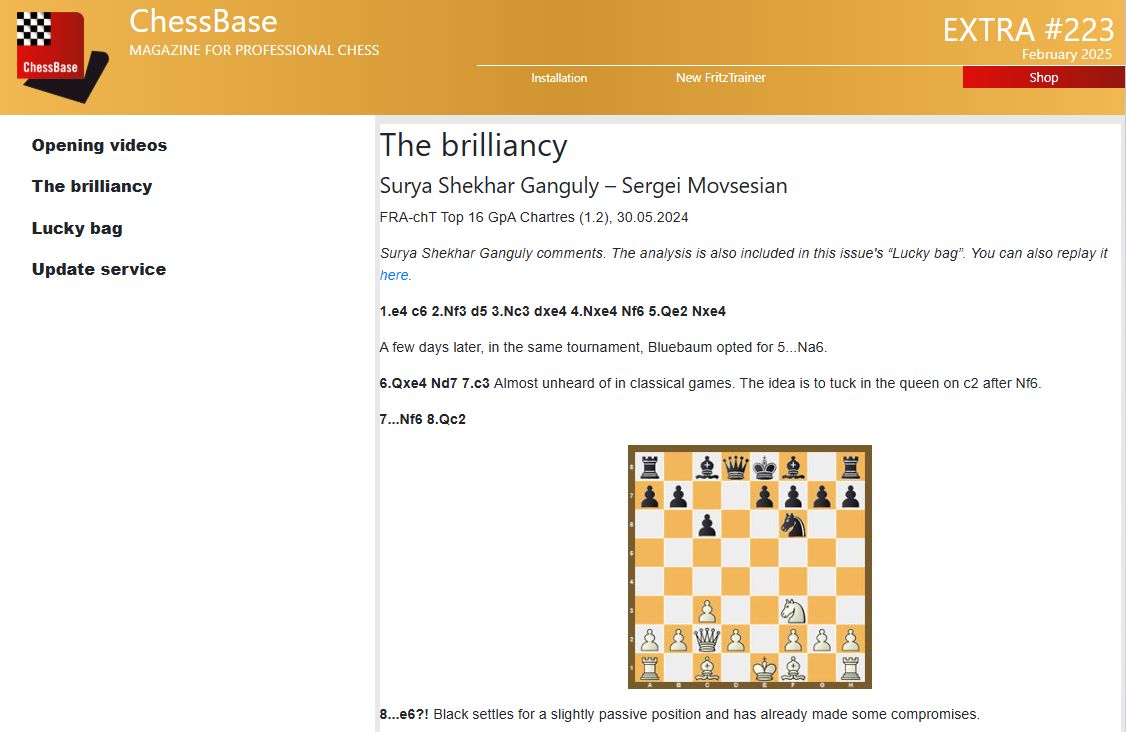 Surya Ganguly, who will provide a comprehensive video analysis of the Sicilian with 2...e6 3.d4 exd4 4.Dxd4 in the upcoming CBM #224, contributes “The brilliancy” of the issue - a great attacking game against Sergei Movsesian from the French League 2024, in which Black was already lost after his 14th move: “14...Qd5? After that move there was no chance of saving the game.”