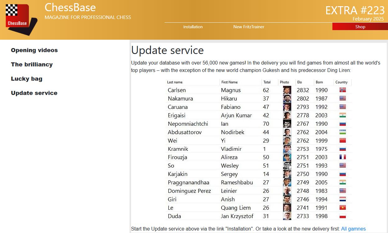 The games of the update service are also included in the Mega Update Service 2025, which can be used with the programs ChessBase 17/18 (and a corresponding subscription).