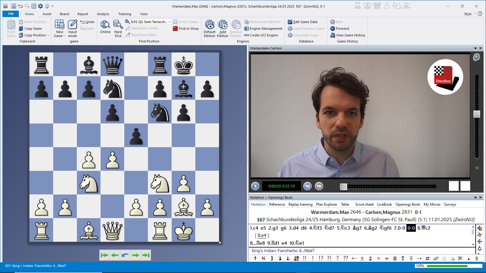 On his way to the Tata Steel Masters 2025, Leon Luke Mendonca stopped off in Hamburg, among other things to record one of his best games from the past year in video format in the ChessBase Studio. His choice was his White win against Harika Dronavalli at the Chennai GM Challengers 2024. Against the French Defence, Mendonca went for the Advance Variation, in which his opponent followed up 1.e4 e6 2.d4 d5 3.e5 c5 4.c3 Nc6 5.Nf3 with 5...Qb6. With 6.a3 c4 7.Nbd2 Na5 8.Rb1 Bd7 9.h4 0-0 10.b3 and an early exchange of queens Mendonca gained a long-term strategic advantage.