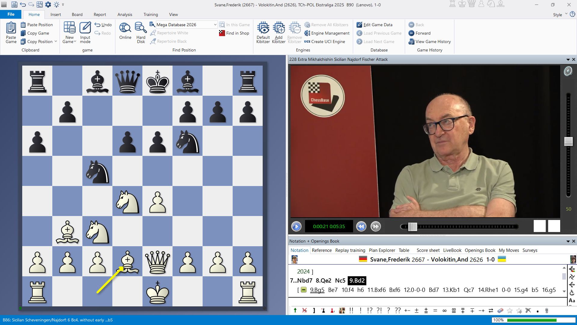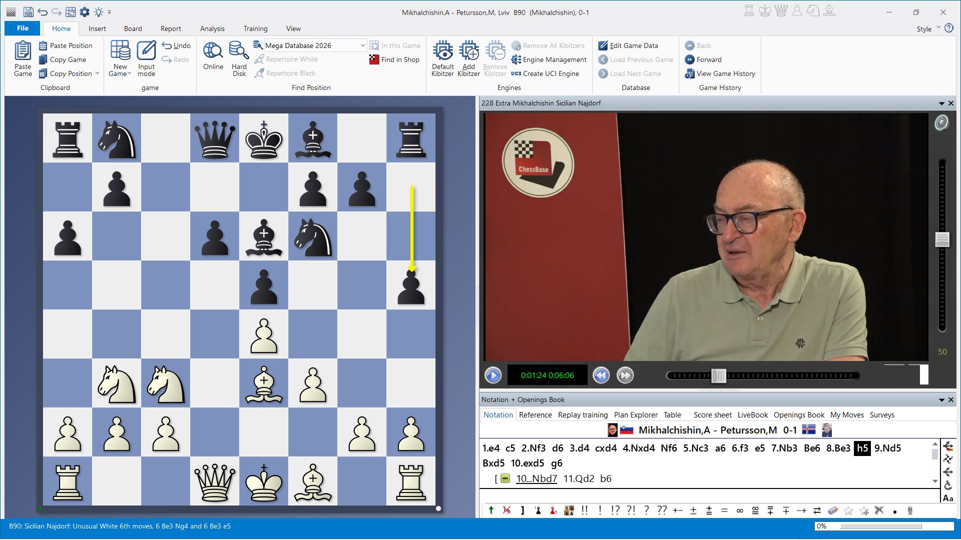 6.Bc4 was one of Bobby Fischer's favourite weapons against the Najdorf Variation. White then wants to carry out the ‘Fischer Attack’ by advancing the f-pawn. Mikhalchishin shows a modern treatment of this idea by Frederik Svane against Andrei Volokitin (2025): After 6...e6 7.Bb3 Nbd7, he continued with 8.Qe2 Nc5 9.Bd2, intending to castle long immediately. Only then did he set his pawns in motion on the kingside. ‘Probably, the Fischer Attack is alive!’