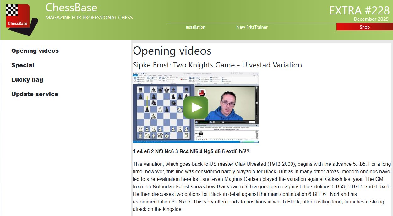This variation was developed over 80 years ago by the American Olav Ulvestad, but for a long time it was considered hardly playable for Black. However, modern engines have led to a rethink in this area. In his video analysis, GM Sipke Ernst brings the sidelines 6.Bb3, 6.Bxb5 and 6.dxc6 as well as the main continuation 6.Bf1 up to date.