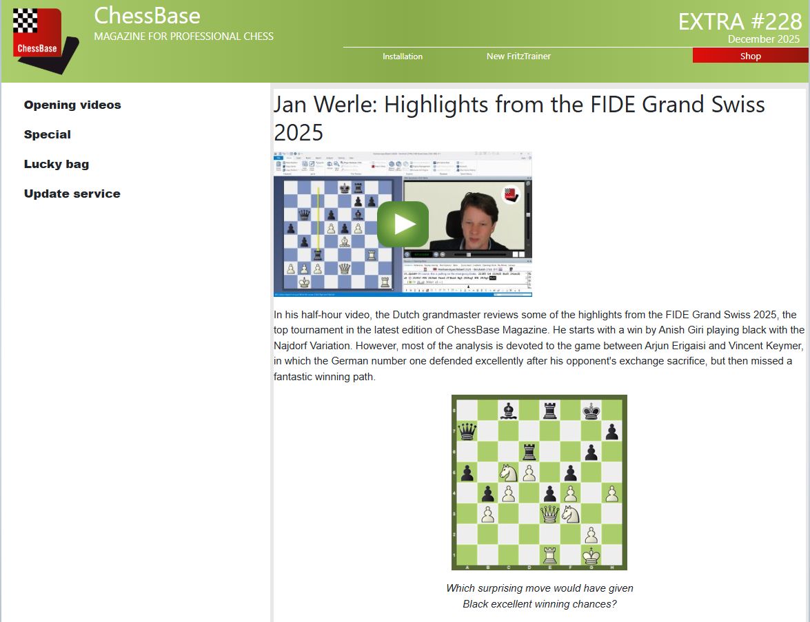Extra #228 delivers 40 annotated games from a wide variety of tournaments in the ‘Lucky bag’.
